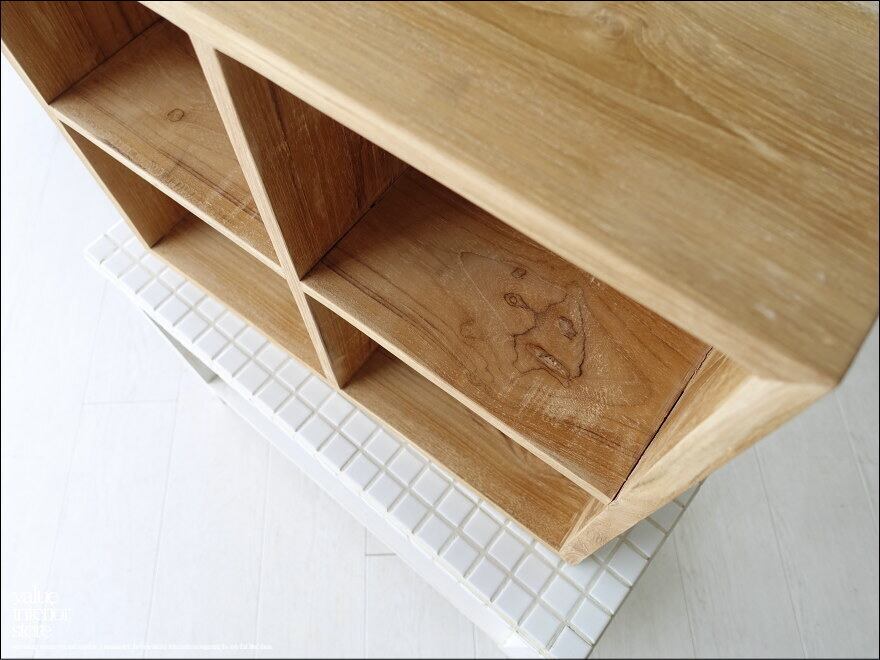 ナチュラルな木目が美しいチーク総無垢材の収納シェルフ。
