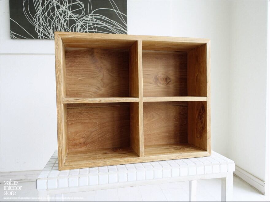 大きさのあるウォールシェルフで、横置き、縦置きとご使用方法に応じてお使いいただけ、仕切りも小分けに整理して収納いただけます。硬さと張りのあるチーク材独特のビシッとした質感が伝わってきます。