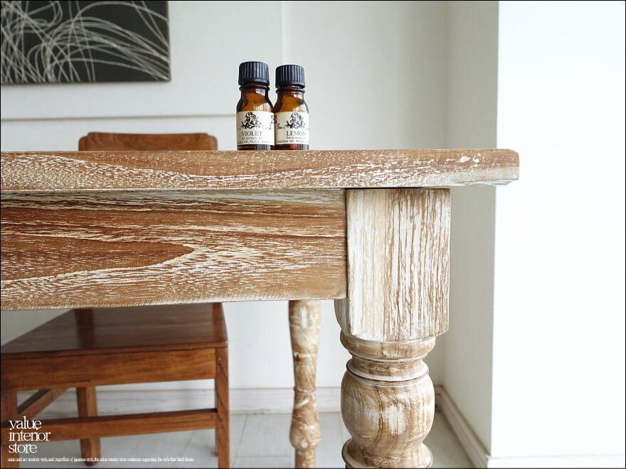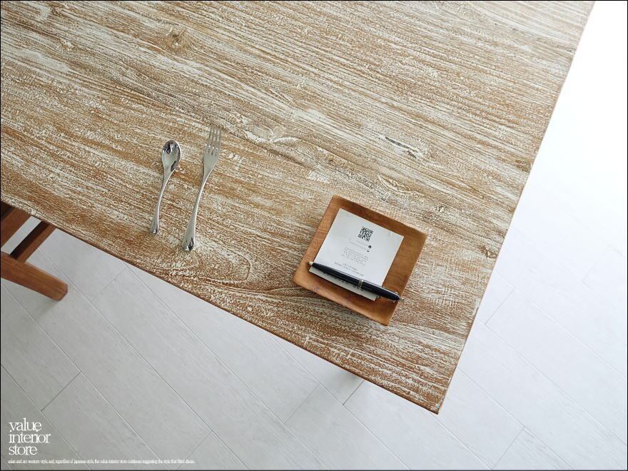 天板を支えるフレーム部分にもしっかりと厚みがあり重厚感があり、落ち着いた大人の雰囲気があります。チークの渋く硬い特徴を引き出す角型の天板を柔らかな丸脚が支えていて、そのバランスが上品です。シンプルなデザインで、チークの良さを存分に楽しんでいただける、とてもステキなダイニングテーブル。こんなテーブルで毎日食事ができたらペースダウンできステキでしょうね。ショップやカフェのテーブルとしてもおすすめです。