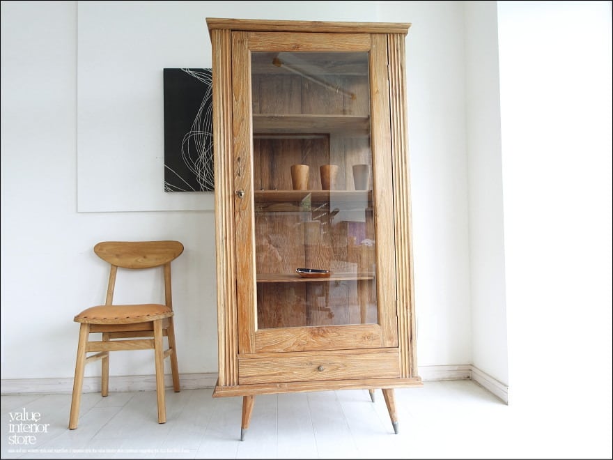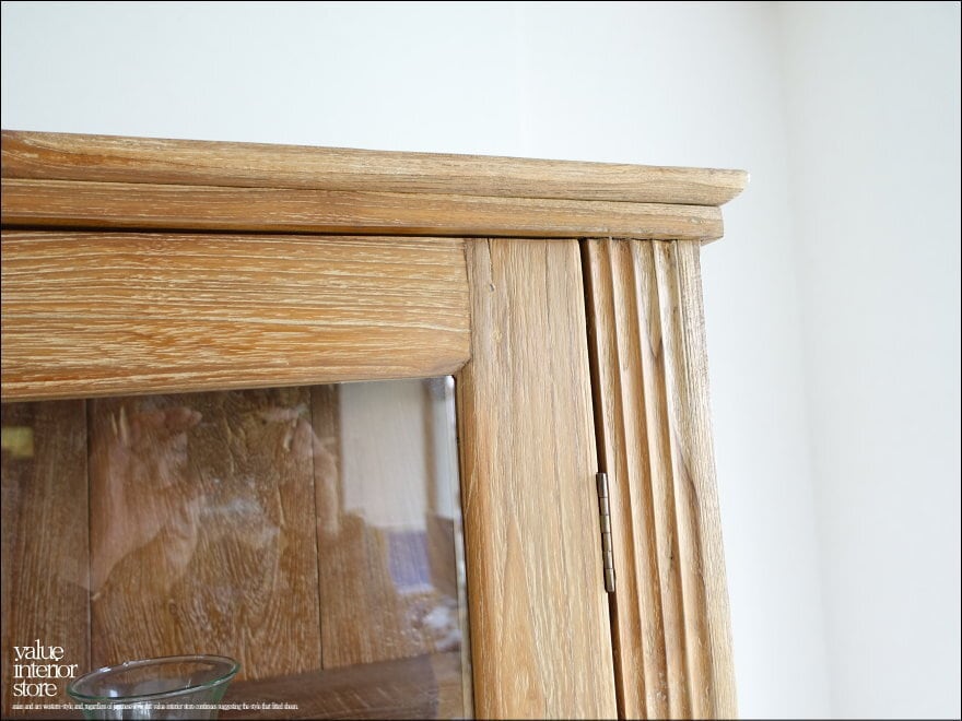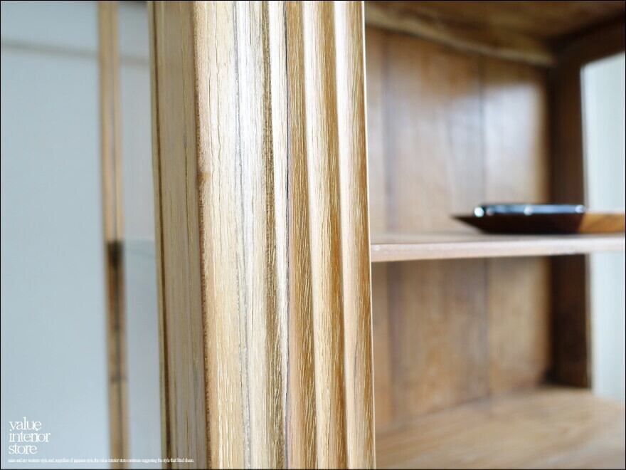 存在感のある大きさで奥行きもたっぷりあるのでキッチンの食器棚としてもリビングの収納棚としても便利にお使いいただけます。扉はガラスなのでディスプレイするような感覚で中に入れるものにもこだわりたくなります。扉は真鍮鍵付き。鍵がとても可愛らしく、きちんと機能しています。全体的に素朴で落ち着いた色合いでシックな雰囲気を残した表面処理(ワイヤーブラシで表面を削るラスティック仕上げ)になっています。カフェやショップなどの什器として食器棚、本棚、収納棚などにもおすすめです。