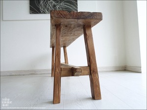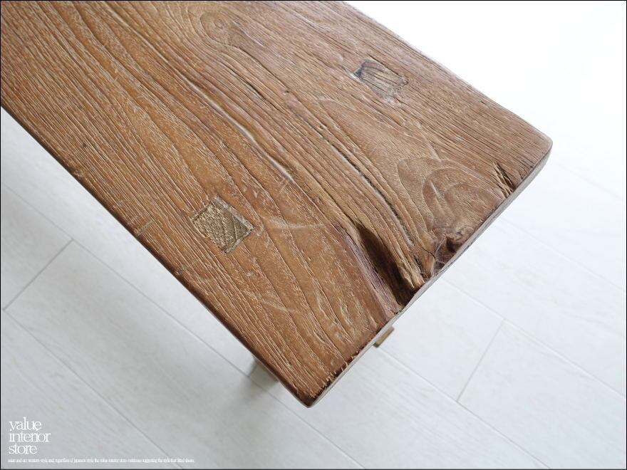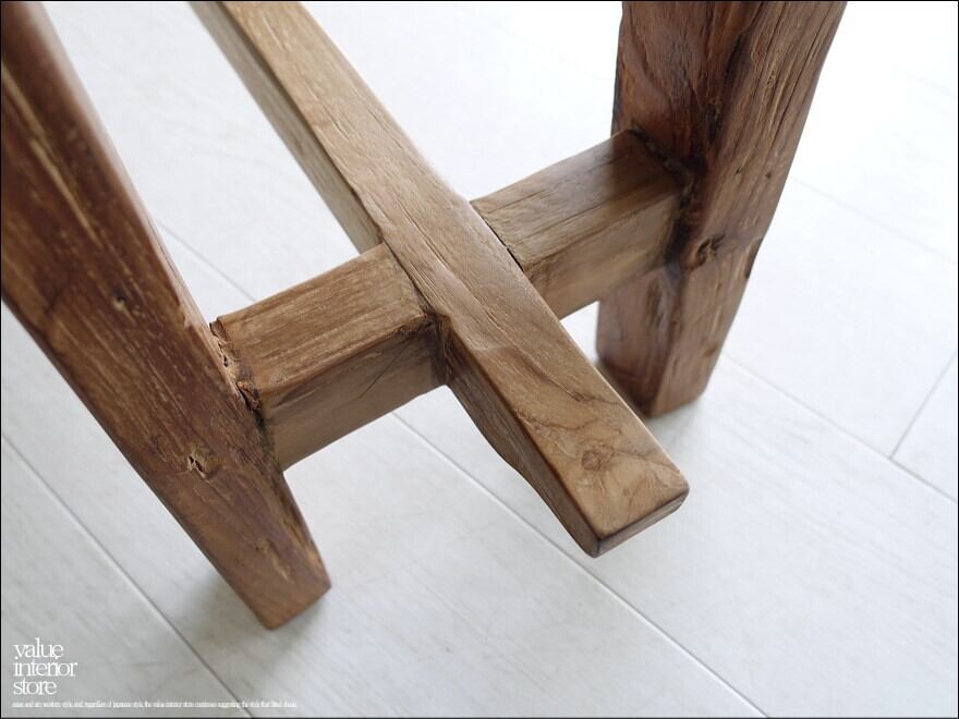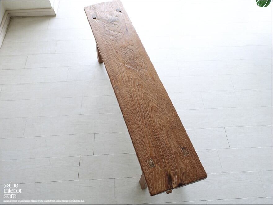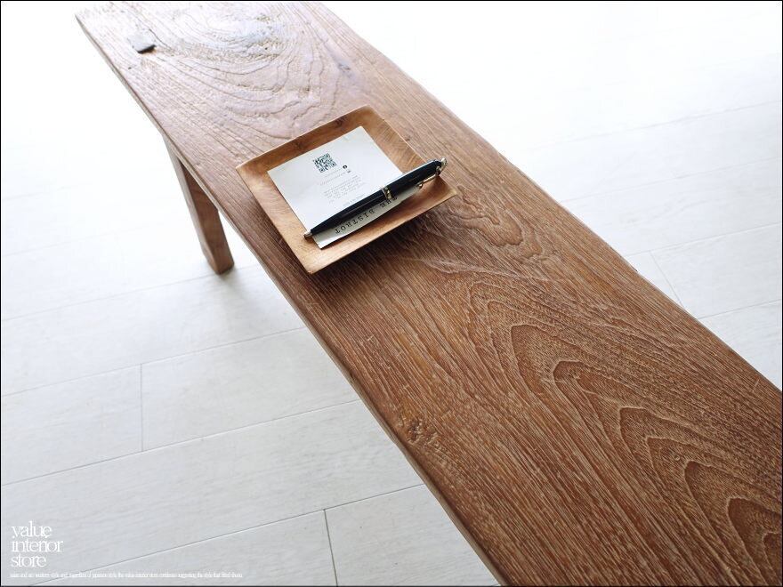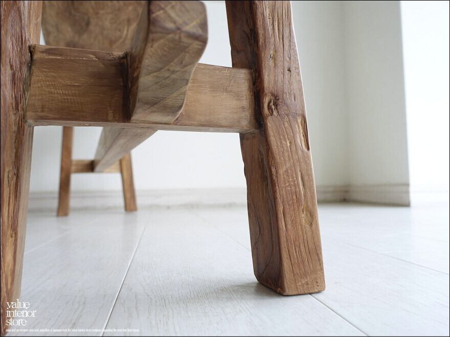 一枚板の座面は厚みもあり長くお使いいただけるしっかりした作りです。チークならではの木目と古材ならではの木肌が全体的に見られ味わい深く仕上がっています。職人さんが丹精こめて作った印象に溢れていて、きっとお部屋をスローダウンした素敵な雰囲気に包んでくれます。ベンチだけでなくインテリアのディスプレイ台としてもステキです。