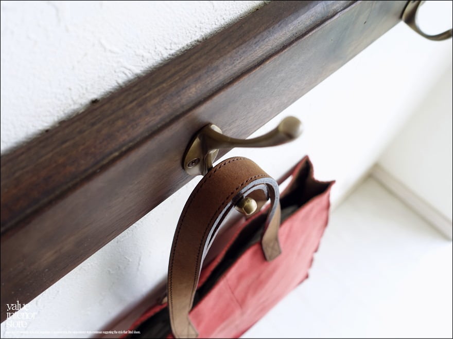 厚みのあるチーク無垢材に大きめの真鍮ダブルフックがついた壁付けハンガー。