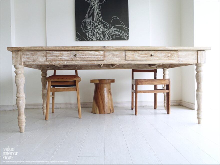 ◇日本製のような正確さは無いかもしれませんが、1点1点出来上がるまでの殆どの製作工程を手作業で行う、インドネシア家具職人たちの手づくり製法はとても暖か味が感じられます。細かな傷、ひび割れやフシ穴、色の濃淡、また反りなどの無垢材特有の”暴れ”や修理痕が見受けられる場合がございますが、無垢材の素材や特徴、また手づくりのテイストとして工業品にはない自然の質感をお楽しみ下さい。