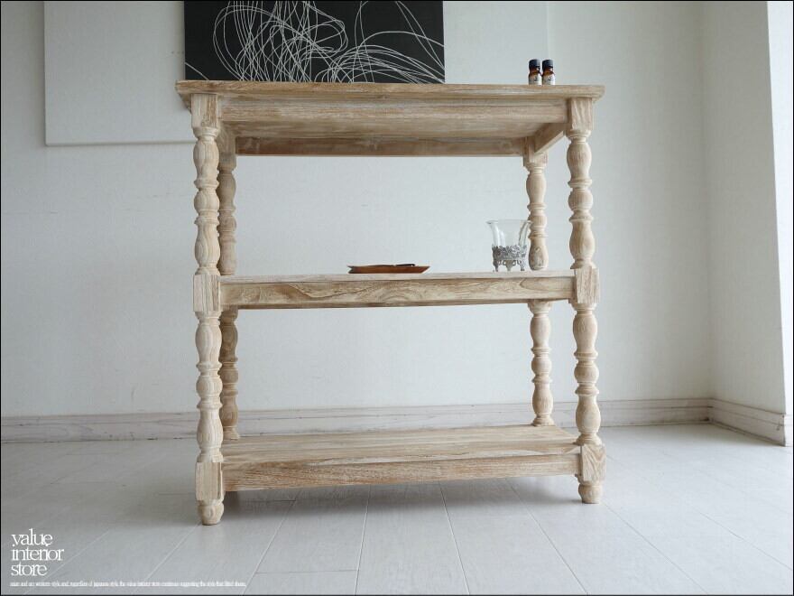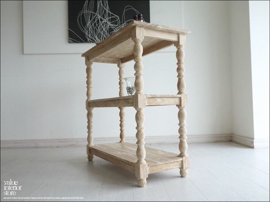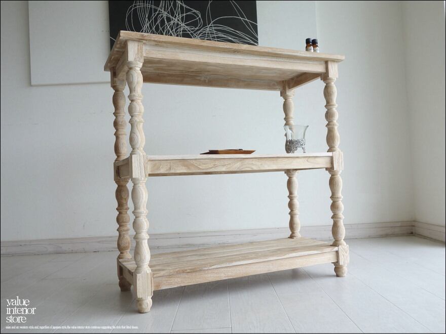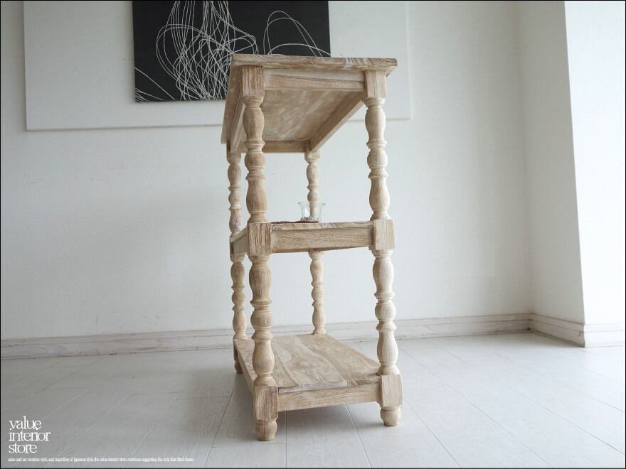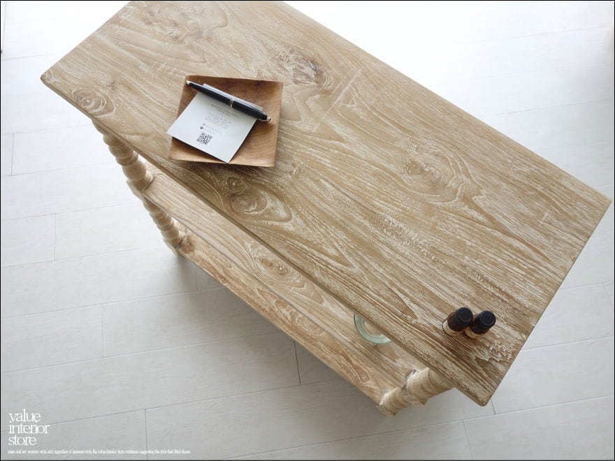表面は凹みに白色を薄く残したナチュラルホワイト仕上げ。表面仕上げに一工夫することで、一層素朴で明るい雰囲気に仕上がりました。余分な装飾を無くしたシンプルな棚板と、丸く柔らかな印象の脚とのバランスがとってもかわいいですよ。きっとお部屋を素敵な雰囲気に包んでくれます。