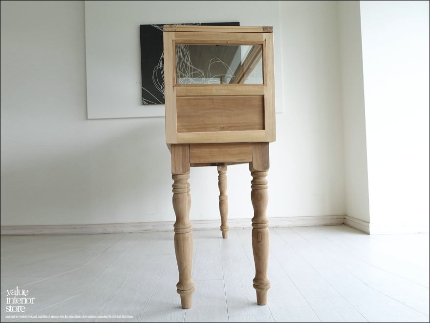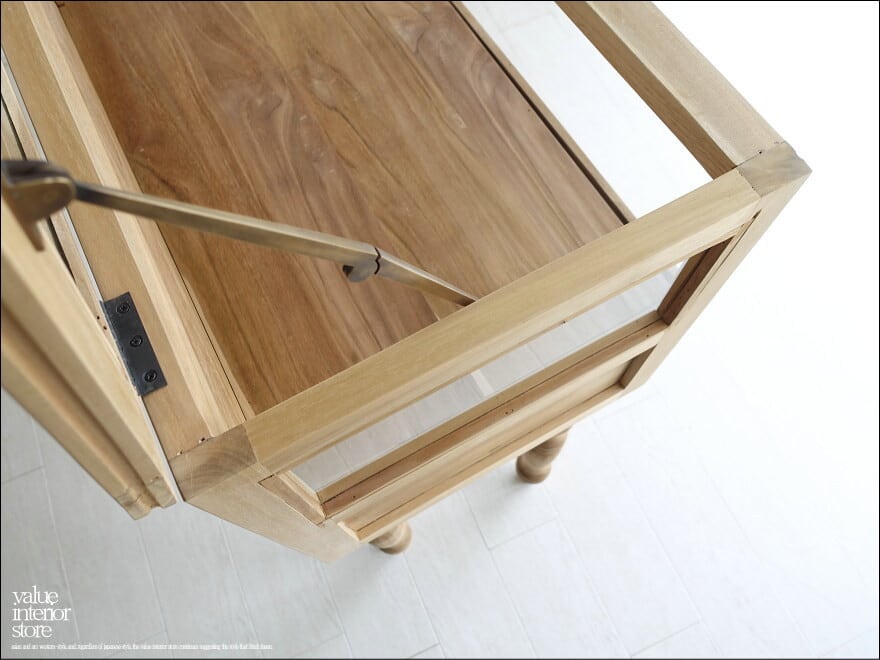 無塗装のチーク材の素朴な質感とクリアガラスの組み合わせが素敵です。ガラス部分には時計やアクセサリーを、チェストには衣類を収納したりと使い分けができます。ショップのショーケースとしてもチェストに在庫を収納できますので便利です。木目の美しいチークは変わり行く色の変化(いわゆるチークカラーへの変化)もお楽しみいただけます。1点1点手作りで、無垢材の良さ感じさせてくれます。お気に入りスペースでお使い下さい。(バリューインテリアストアオリジナル)