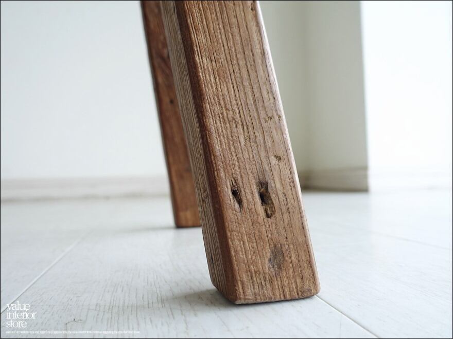 変化に富んだ一枚板の座面は厚みもあり長くお使いいただけるしっかりした作りです。チークならではの木目と古材ならではの木肌が全体的に見られ味わい深く仕上がっています。職人さんが丹精こめて作った印象に溢れていて、きっとお部屋をスローダウンした素敵な雰囲気に包んでくれます。ベンチだけでなくインテリアのディスプレイ台としてもステキです。