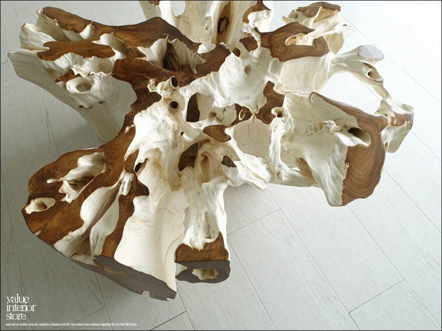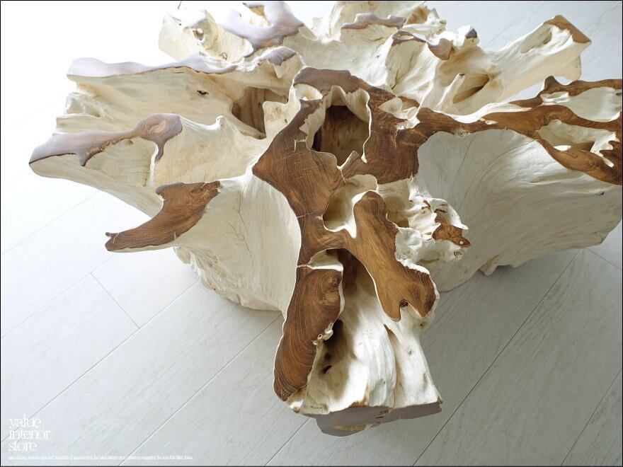 チークの根本をテーブルに使った何ともプリミティブなガラステーブル。