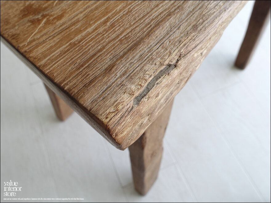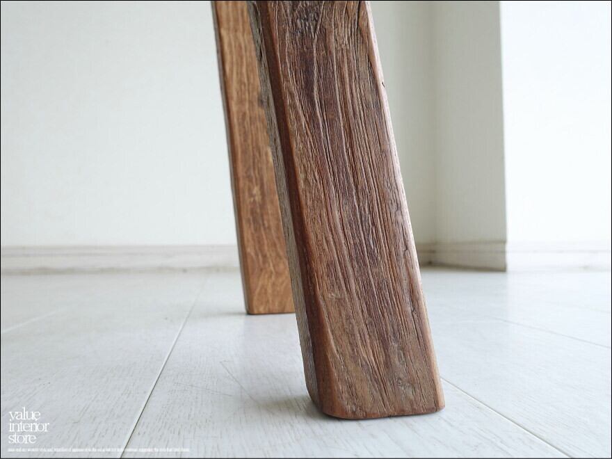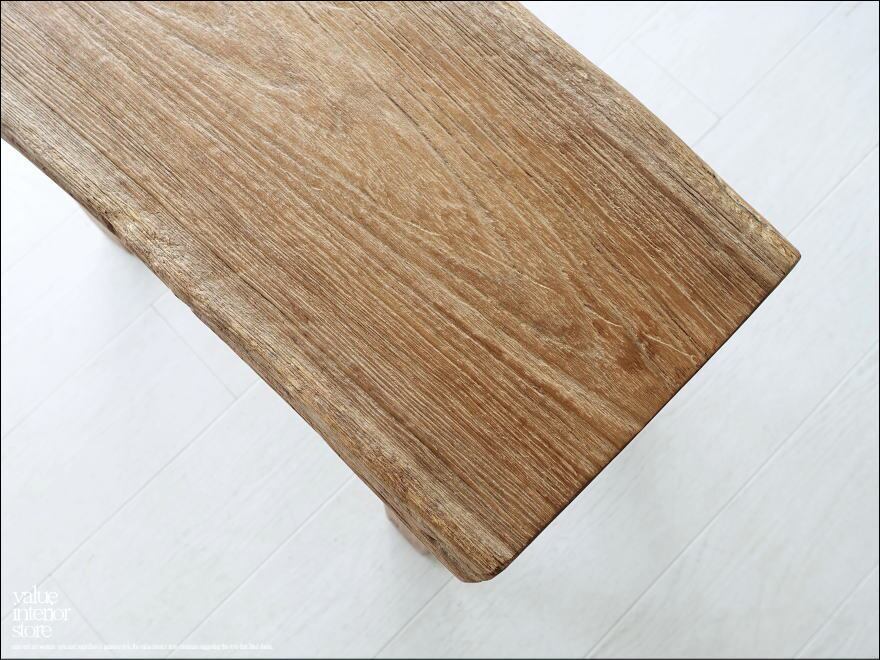 変化に富んだ一枚板の座面は厚みもあり長くお使いいただけるしっかりした作りです。チークならではの木目と古材ならではの木肌が全体的に見られ味わい深く仕上がっています。職人さんが丹精こめて作った印象に溢れていて、きっとお部屋をスローダウンした素敵な雰囲気に包んでくれます。ベンチだけでなくインテリアのディスプレイ台としてもステキです。