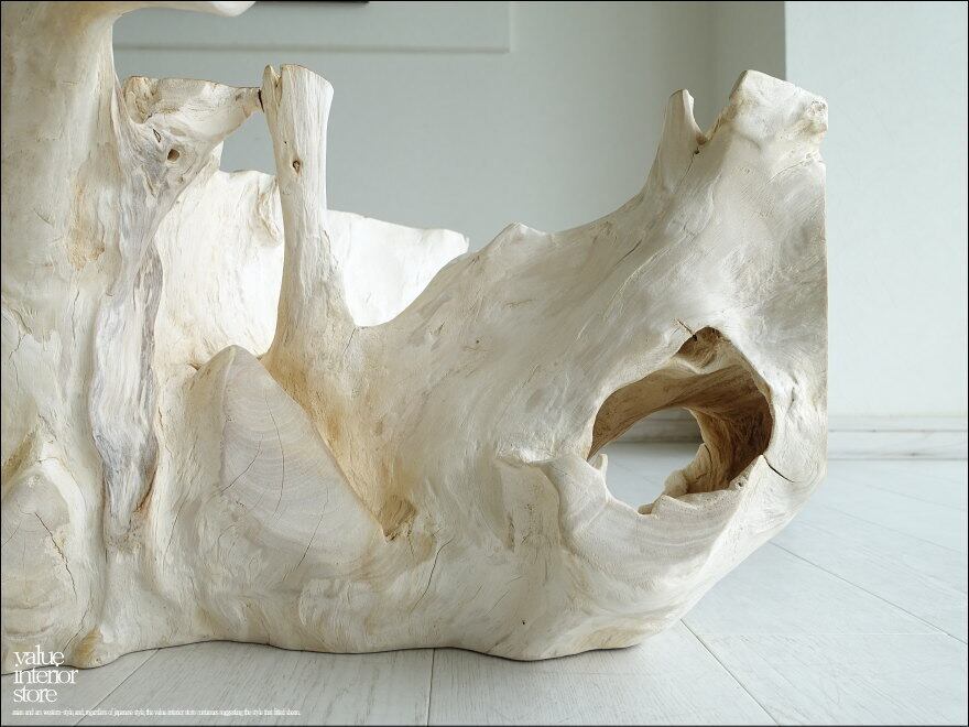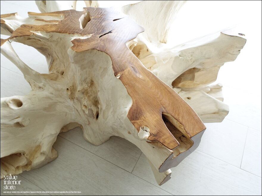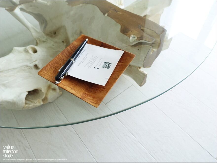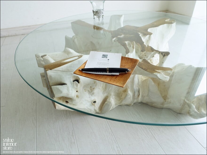 チークの根本をテーブルに使った何ともプリミティブなガラステーブル。