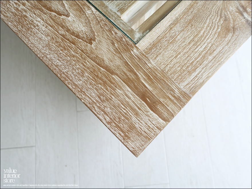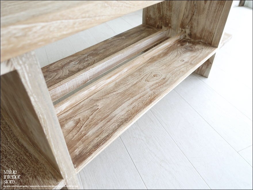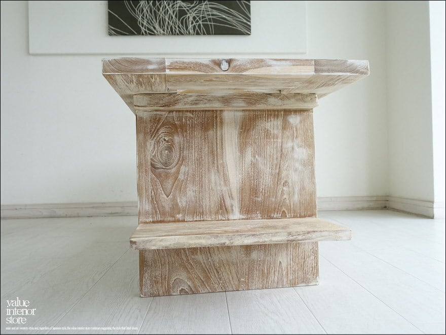チーク独特の細かな木目が美しく、表面はワイヤブラシで凹凸をつけてから白色を塗布した後にサイディングしたナチュラルホワイト仕上げ。チークの持つ硬く張りのある質感は触っていただくだけで感じていただけます。お部屋のリビングなどお気に入りスペースでぜひお楽しみ下さい。