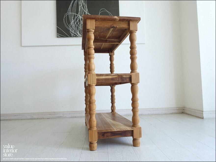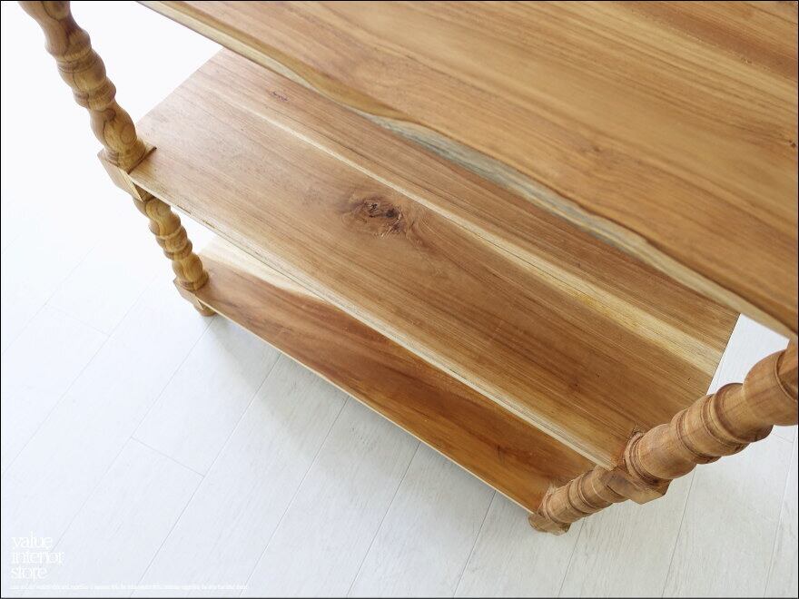 ナチュラルで素朴な質感は、経年変化でいわゆるチーク色へ徐々に変化していくところも楽しみの一つです。余分な装飾を無くしたシンプルな棚板と、丸く柔らかな印象の脚とのバランスがとってもかわいいですよ♪