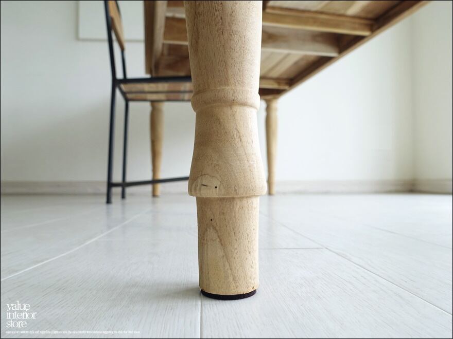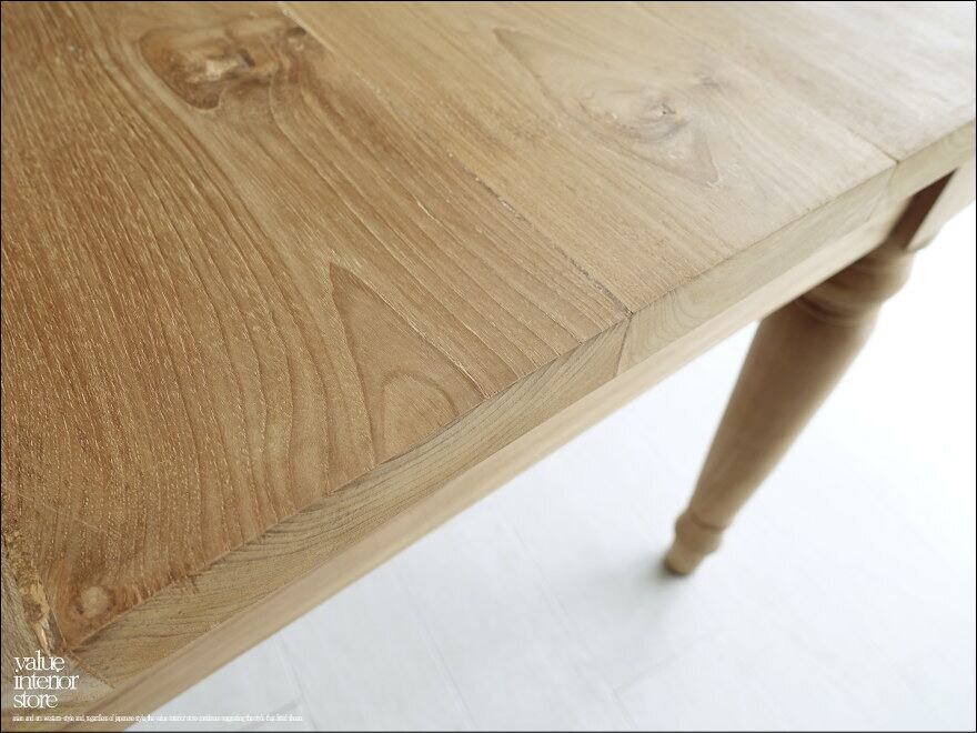 天板を支える曲線的なデザインが柔らかな印象を持たせます。チークの渋く硬い特徴やフシなどの木が本来持つ個性的なキャラクターが面白く、また、手作りでしか出せない素朴な質感とのバランスもとても良いです。良質な油分を豊富に含むチーク材ですので、徐々にチーク色に変化していくところも楽しんでいただけるダイニングテーブルです。