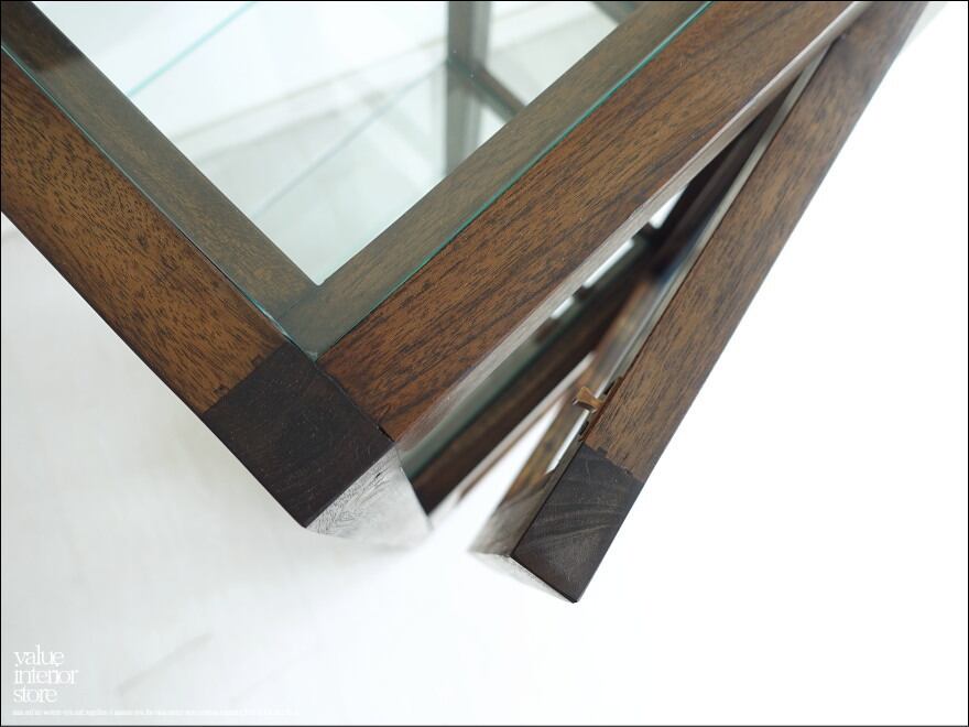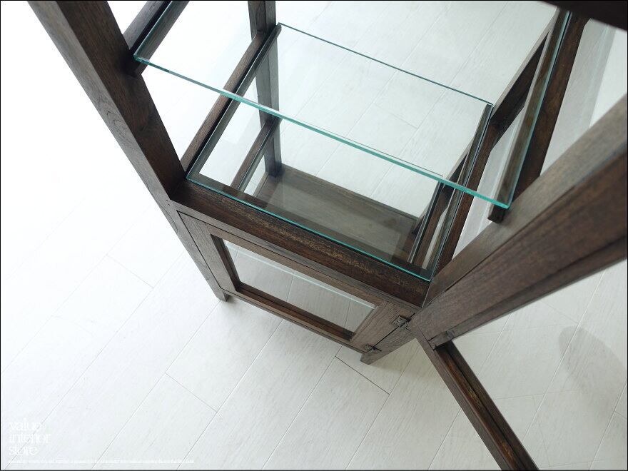 フレームは贅沢にチーク総無垢で、金具は真鍮製を使用いたしました。3面ガラスでどの角度からも中がキレイに見えますので、お店のショーケースとしてもお使いいただけます。また扉は上下2つに分かれていて上の扉には真鍮のロックも付いています。アンティークではありませんが古くからそこにあったような温か味のある仕上がりになっています。カフェなどのパン用ショーケース、食器棚、小物のディスプレイなど幅広くお使いください。