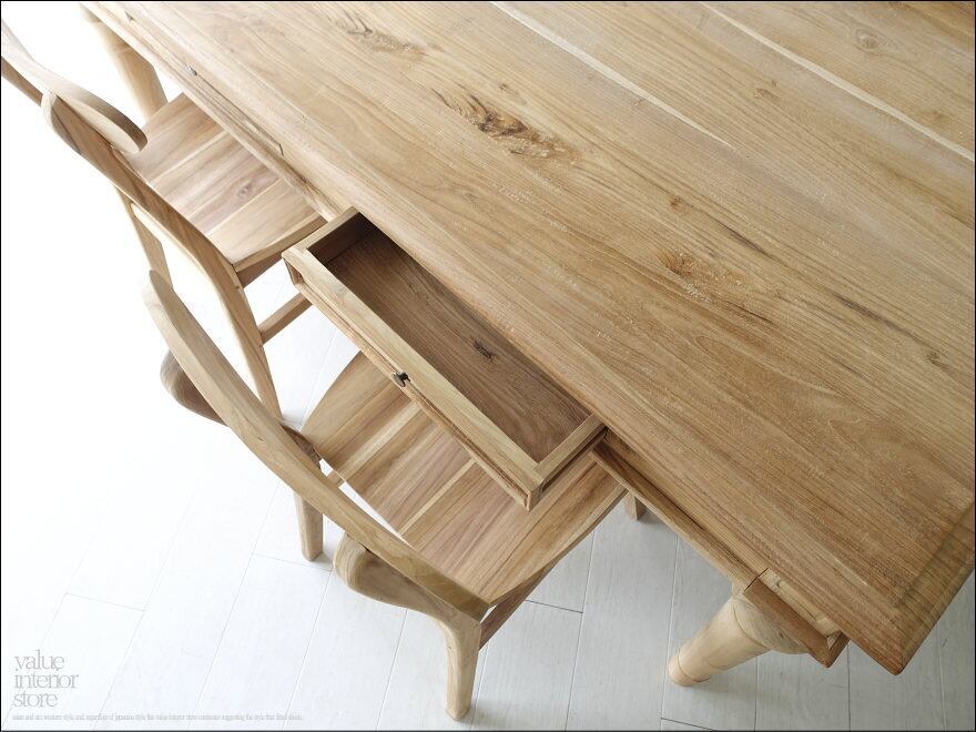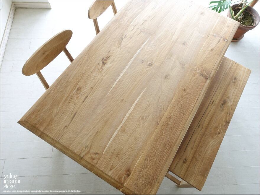 チークの渋く硬い特徴やフシなどの木が本来持つ個性的なキャラクターが大変面白く、また、手作りでしか出せない素朴な質感とのバランスもとても良いです。良質な油分を豊富に含むチーク材ですので、徐々にチーク色に変化していくところも楽しんでいただけるダイニングテーブルです。