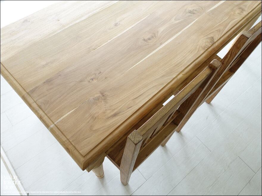 チークの渋く硬い特徴やフシなどの木が本来持つ個性的なキャラクターが大変面白く、また、手作りでしか出せない素朴な質感とのバランスもとても良いです。良質な油分を豊富に含むチーク材ですので、徐々にチーク色に変化していくところも楽しんでいただけるダイニングテーブルです。