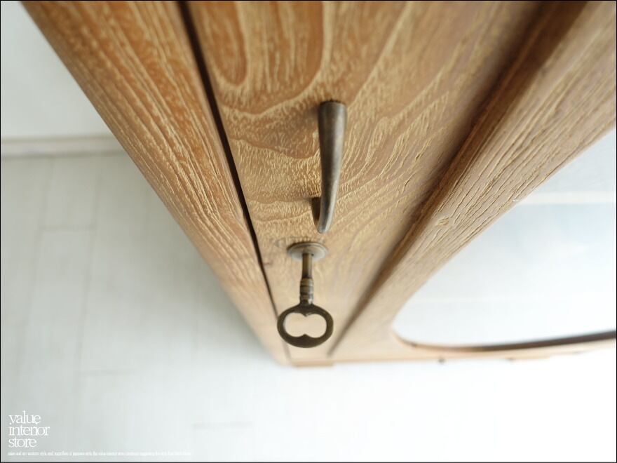 存在感のある大きさで奥行きもたっぷりあるのでキッチンの食器棚としてもリビングの収納棚としても便利にお使いいただけます。扉はガラスなのでディスプレイするような感覚で中に入れるものにもこだわりたくなります。扉は真鍮鍵付き。鍵がとても可愛らしく、きちんと機能しています。全体的に素朴で落ち着いた色合いでシックな雰囲気を残した表面処理(ワイヤーブラシで表面を削るラスティック仕上げ)になっています。カフェやショップなどの什器として食器棚、本棚、収納棚などにもおすすめです。