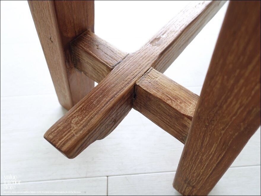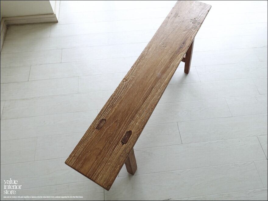 一枚板の座面は厚みもあり長くお使いいただけるしっかりした作りです。チークならではの木目と古材ならではの木肌が全体的に見られ味わい深く仕上がっています。職人さんが丹精こめて作った印象に溢れていて、きっとお部屋をスローダウンした素敵な雰囲気に包んでくれます。ベンチだけでなくインテリアのディスプレイ台としてもステキです。