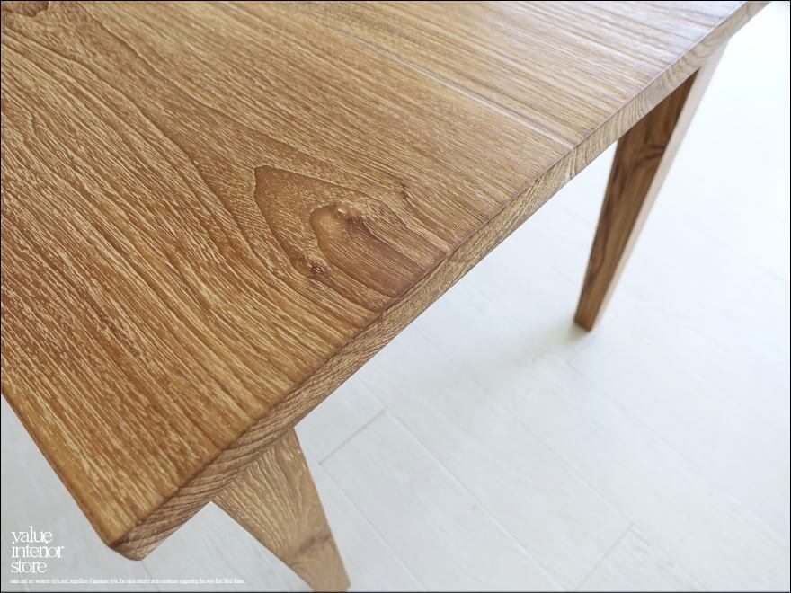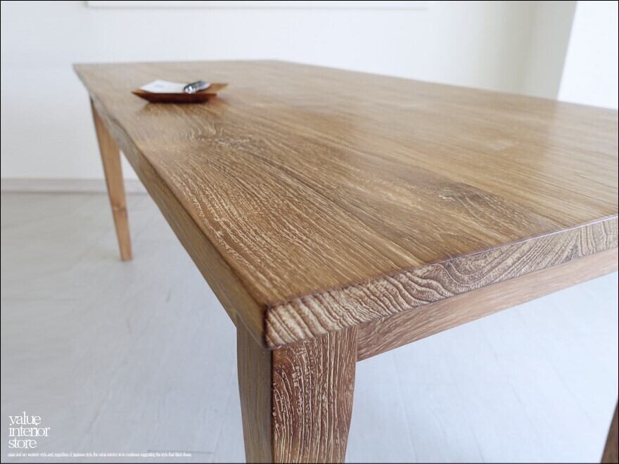 フシや凹凸などの変化に富んだ素材の味わい深さが感じられる、オールドチーク総無垢材のダイニングテーブル。天板を支えるフレーム部分にもしっかりと厚みがあり重厚感があります。昔から使っていたような、古材家具ならではの落ち着いた雰囲気が感じられます。
