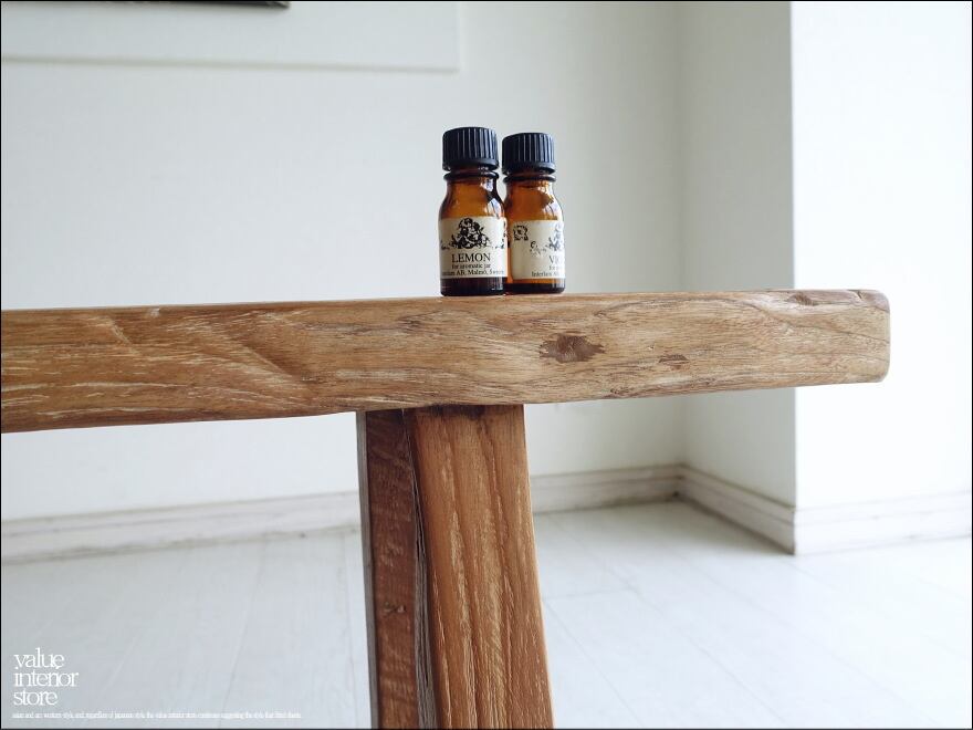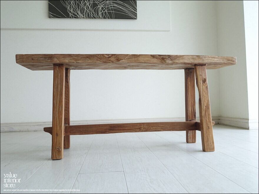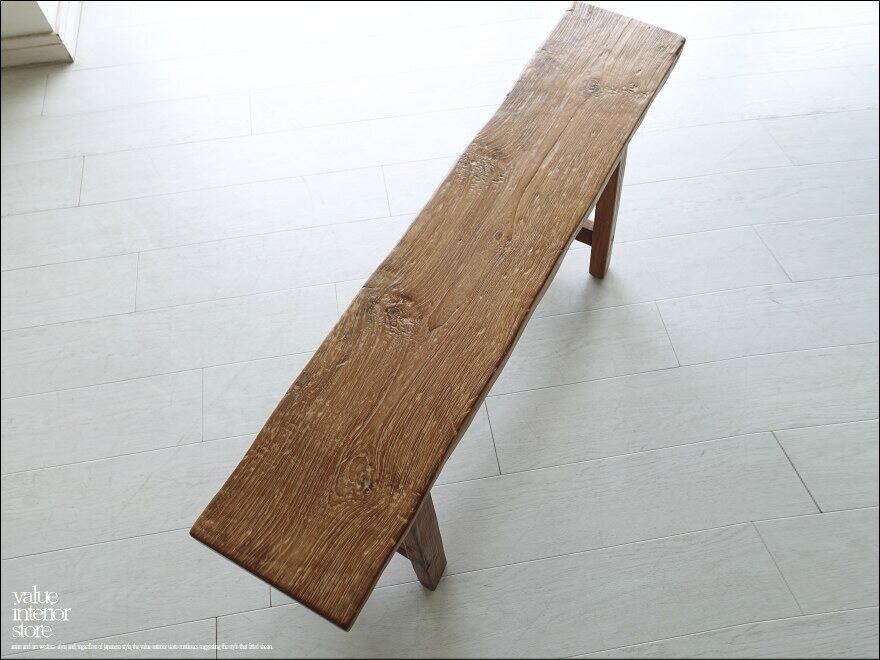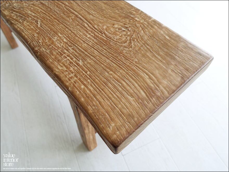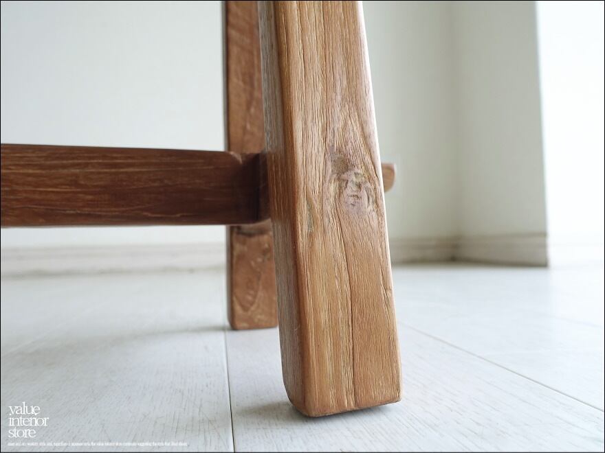 一枚板の座面は厚みもあり長くお使いいただけるしっかりした作りです。チークならではの木目と古材ならではの木肌が全体的に見られ味わい深く仕上がっています。職人さんが丹精こめて作った印象に溢れていて、きっとお部屋をスローダウンした素敵な雰囲気に包んでくれます。ベンチだけでなくインテリアのディスプレイ台としてもステキです。