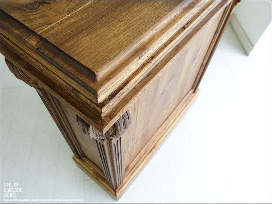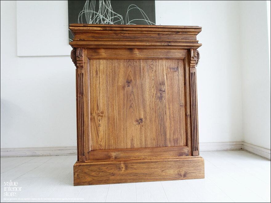 チーク材の美しい木目と質感を感じていただけます。レジカウンター、飾り台としてお使いください。引出しの取っ手には、大きめの無垢の真鍮ハンドルを使用しました。アンティークの雰囲気さえ感じられるカウンターです。雑貨店や美容室のレジ台にもどうぞ。