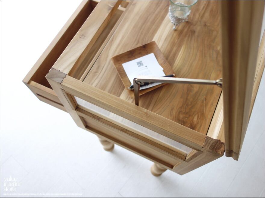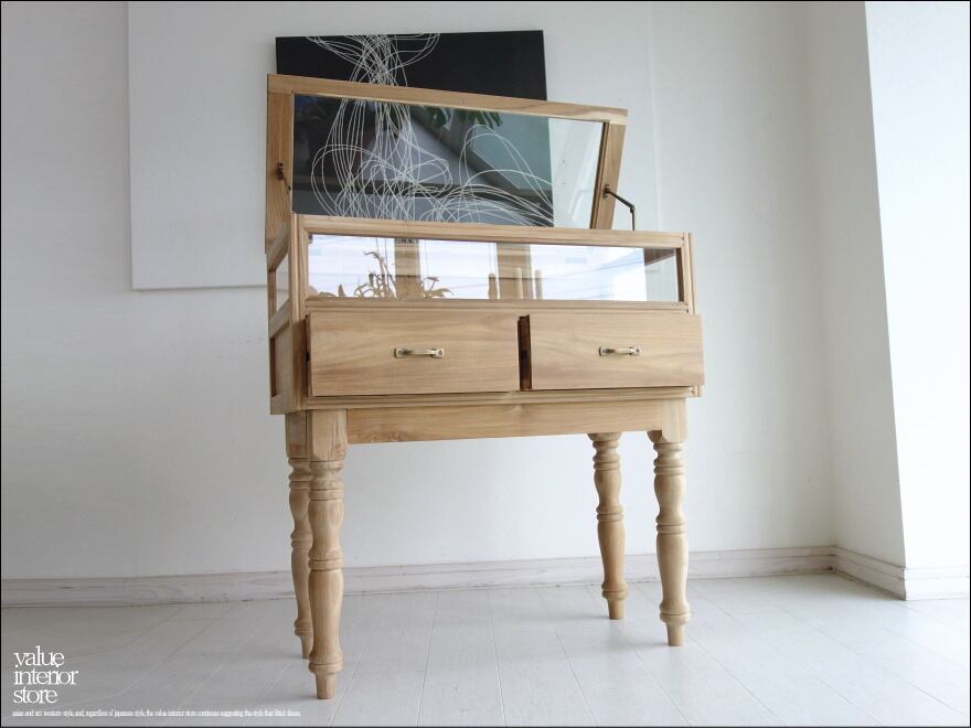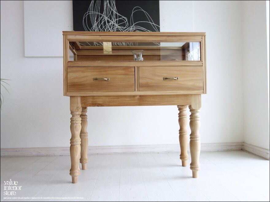 無塗装のチーク材の素朴な質感とクリアガラスの組み合わせが素敵です。ガラス部分には時計やアクセサリーを、チェストには衣類を収納したりと使い分けができます。ショップのショーケースとしてもチェストに在庫を収納できますので便利です。木目の美しいチークは変わり行く色の変化(いわゆるチークカラーへの変化)もお楽しみいただけます。1点1点手作りで、無垢材の良さ感じさせてくれます。お気に入りスペースでお使い下さい。(バリューインテリアストアオリジナル)