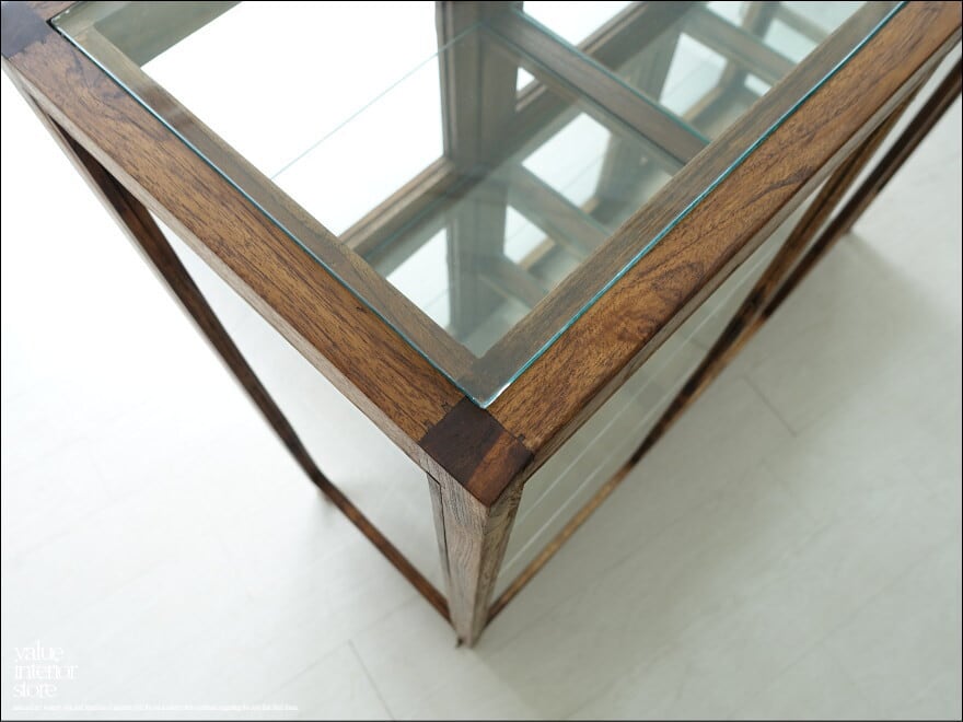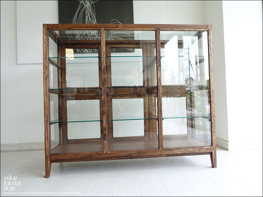 フレームはチーク総無垢材で金具は真鍮製を使用いたしました。ガラス面が多くどの角度からも中がキレイに見えますので、お店のショーケースとしてもお使いいただけます。