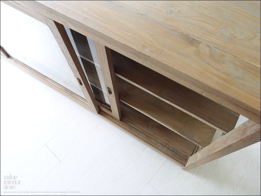 チーク総無垢材で贅沢に仕上げた使い勝手の良いスライド扉ガラスキャビネット。