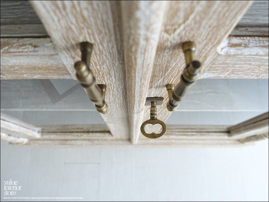 硬さのあるチーク材だからこそできる凹みに白色を入れる表面仕上で、シャビーな印象に仕上がった鍵付きキャビネット。上部の彫り物が、この家具のシンボルマークとなっていて印象的です。クリアガラスで中身が見えるのでディスプレイするような感覚で中に入れるものにもこだわりたくなりますね。食器はもちろん、本棚、収納棚、カフェやショップなどの什器としてもおすすめです。また、チークは油分を多く含みますので、経年変化でコントラストがハッキリとしてくるところも楽しみの一つです。