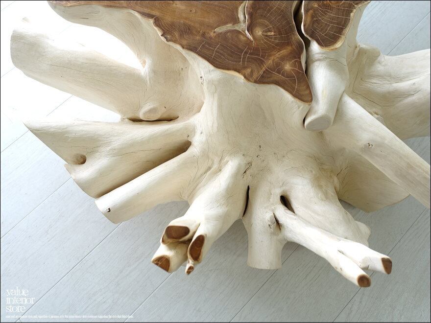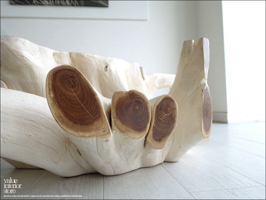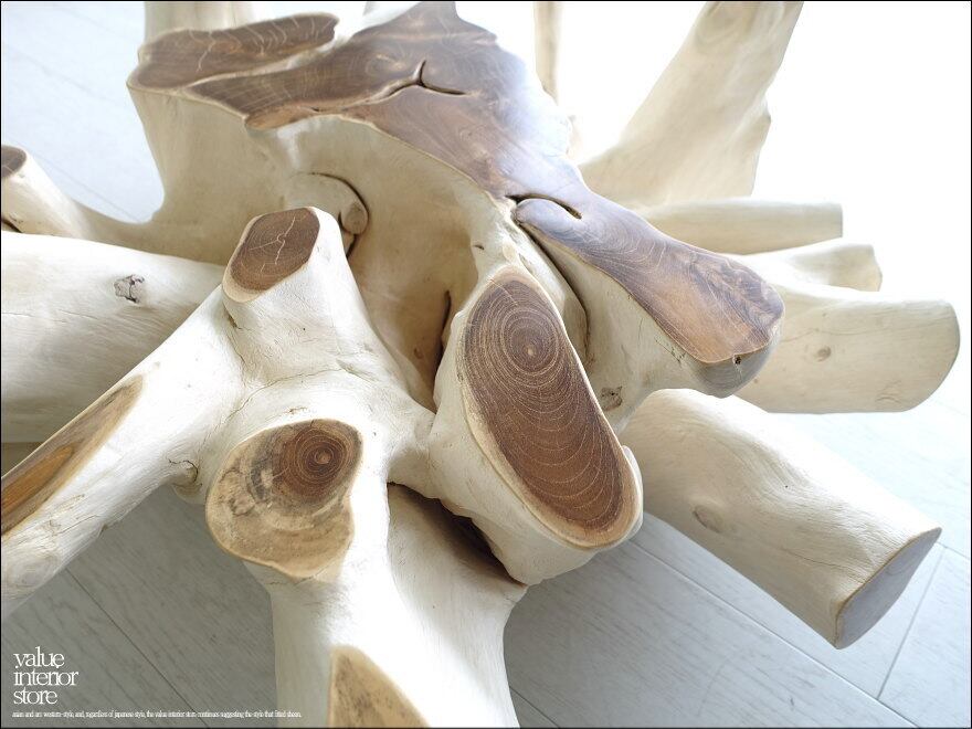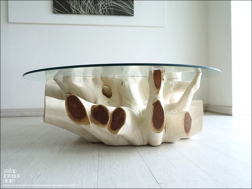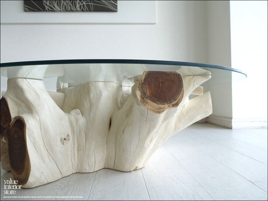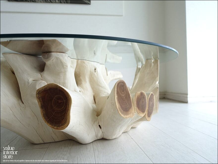 チークの根本をテーブルに使った何ともプリミティブなガラステーブル。