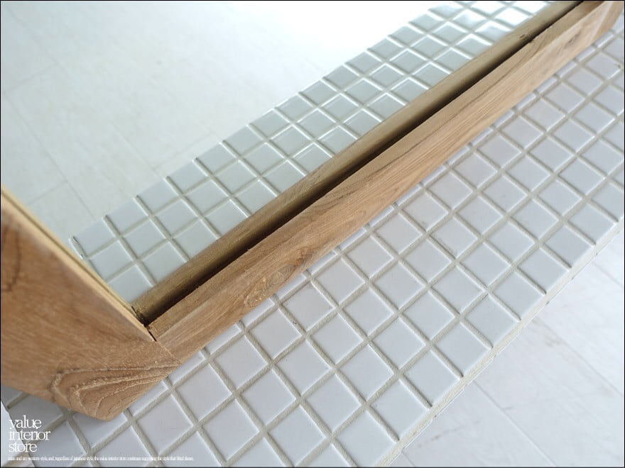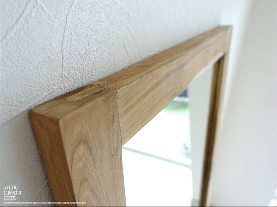 チークの木目が存分に生かされたナチュラルでアンフィニッシングフレームのミラー。