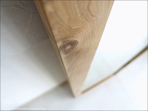 無塗装ですので、いわゆるチーク色に変化していくのが楽しみな、全身を映せるサイズの姿見です。シンプルでどんなテイストにも馴染みやすいデザインですので、空間を暖か味のある雰囲気に演出します。フレーム裏面縦方向に2箇所壁掛け用の穴がありますので壁にビスを設置して頂き引っ掛けるか、安全な場所に立掛けてご使用下さい。