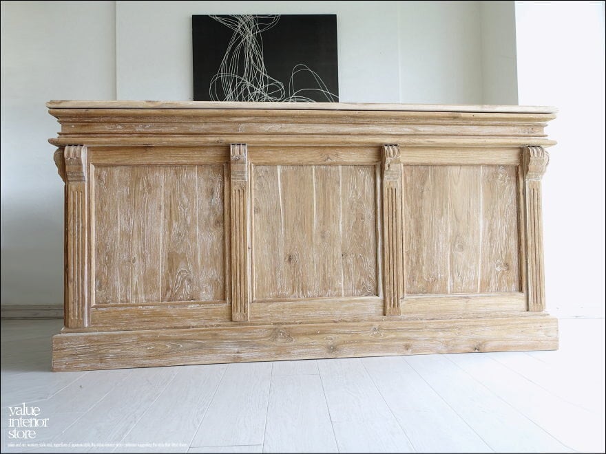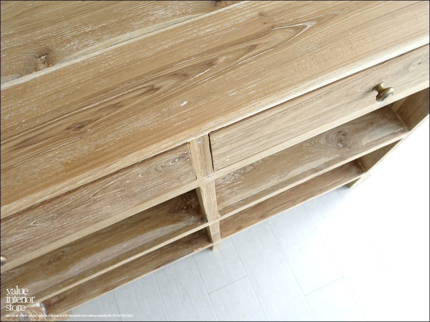表面はチーク材の美しい木目と質感を感じていただけます。カウンターテーブル、飾り台としてお使いください。引出しの取っ手には、大きめの無垢の真鍮ハンドルを使用しました。表面は凹みにわずかに入った白色がシャビーで素朴な印象を感じられます。雑貨店や美容室のレジ台にもどうぞ。