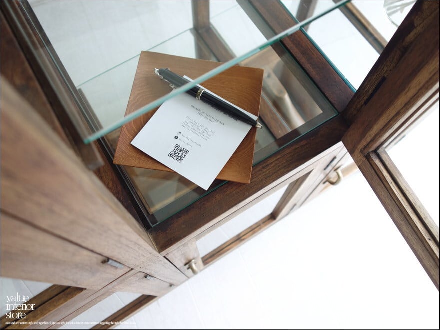 フレームはチーク総無垢材で金具は真鍮製を使用いたしました。ガラス面が多くどの角度からも中がキレイに見えますので、お店のショーケースとしてもお使いいただけます。