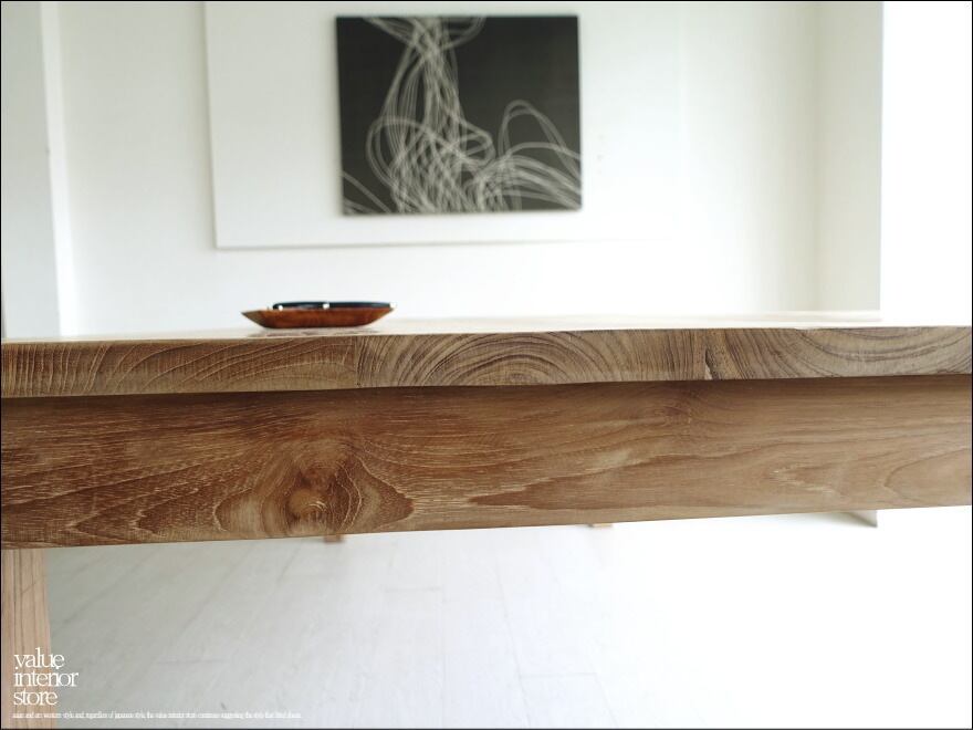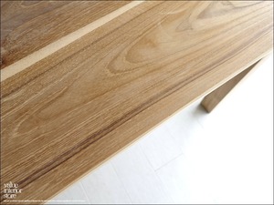 天板を支える脚は太さがあり、どっしりとしていて力強いです。チークの特徴のある木目やフシなどの個性的なキャラクターが素敵で、また、手作りでしか出せない素朴な質感が何とも言えません。良質な油分を豊富に含むチーク材ですので、徐々にチーク色に変化していくところも楽しんでいただけるダイニングテーブル。こんなテーブルで毎日食事ができたらステキでしょうね。ショップやカフェのテーブルとしてもおすすめです。