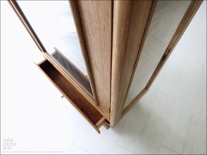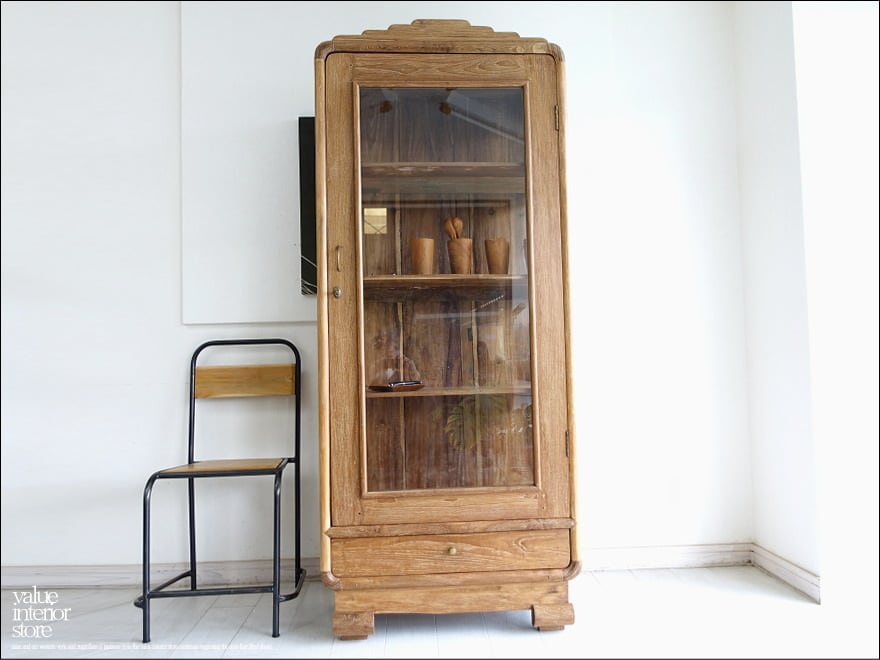 存在感のある大きさで奥行きもたっぷりあるのでキッチンの食器棚としてもリビングの収納棚としても便利にお使いいただけます。扉はガラスなのでディスプレイするような感覚で中に入れるものにもこだわりたくなります。扉は真鍮鍵付き。鍵がとても可愛らしく、きちんと機能しています。全体的に素朴で落ち着いた色合いでシックな雰囲気を残した表面処理(ワイヤーブラシで表面を削るラスティック仕上げ)になっています。カフェやショップなどの什器として食器棚、本棚、収納棚などにもおすすめです。
