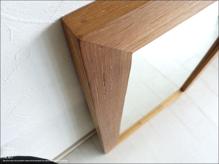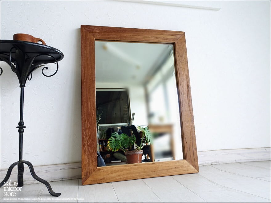 オールドチークならではの味わい深い木目が存分に生かされた厚めのフレームが印象的なミラー。