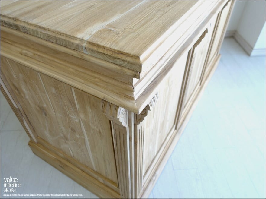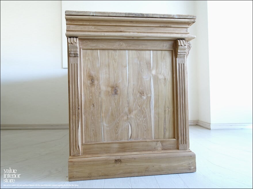 表面はチーク材の美しい木目と質感を感じていただけます。カウンターテーブル、飾り台としてお使いください。引出しの取っ手には、大きめの無垢の真鍮ハンドルを使用しました。表面は凹みにわずかに入った白色がシャビーで素朴な印象を感じられます。雑貨店や美容室のレジ台にもどうぞ。