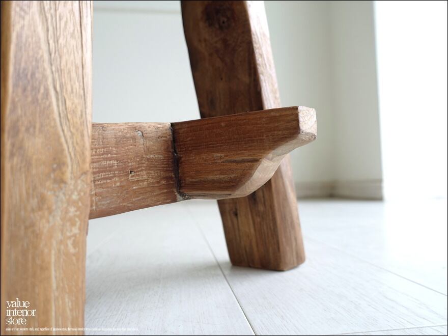 硬いチーク材ならではの荒々しさがありますが、良く紙やすりで磨かれていますので滑らかで、一枚板の座面は厚みもあり長くお使いいただけるしっかりした作りです。チークならではの美しい木目が全体的に見られとても味わい深いお品。職人さんが丹精こめて作った印象に溢れていて、きっとお部屋をスローダウンした素敵な雰囲気に包んでくれます。ベンチだけでなくインテリアのディスプレイ台としてもステキです。