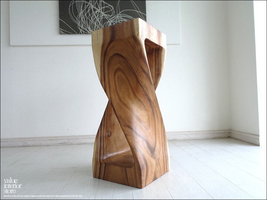 緩やかな螺旋の曲線が優しい印象のモンキーポッド総無垢材のバースツール。ナチュラルな雰囲気で幅広いテイストに合わせやすく設置しやすいスツール。スツール以外にも花台やディスプレイ台としてもお勧めです。お気に入りの空間でぜひお使い下さい。