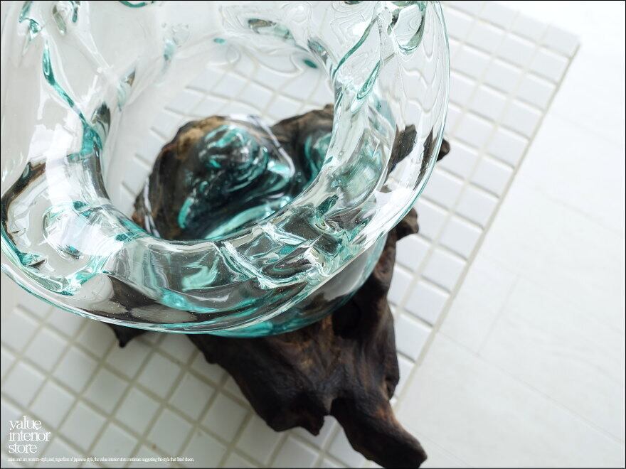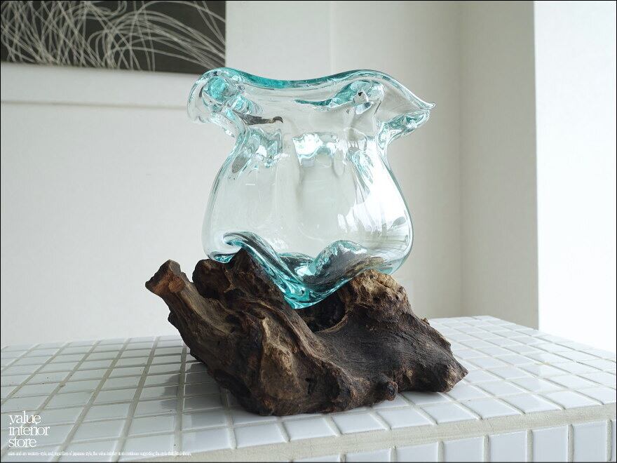 プリミティブな無垢材の土台に吹きガラスを合わせたフラワーベース。メダカ鉢にも良いサイズです。同じ形のものはなく、どちらの素材も大変個性的で味があります。