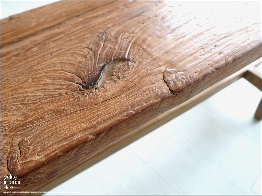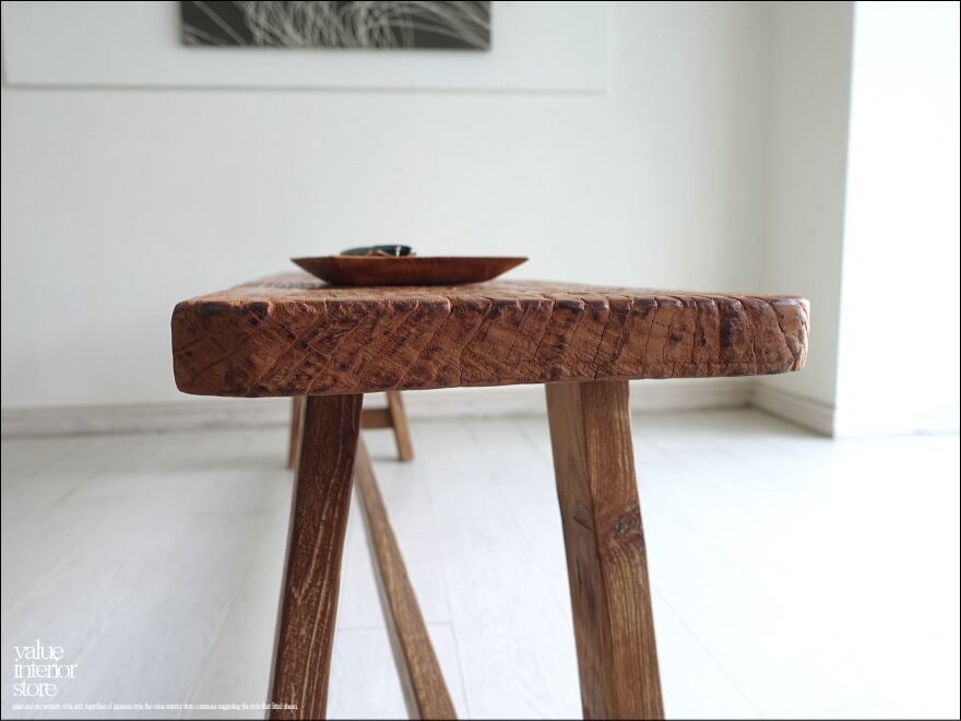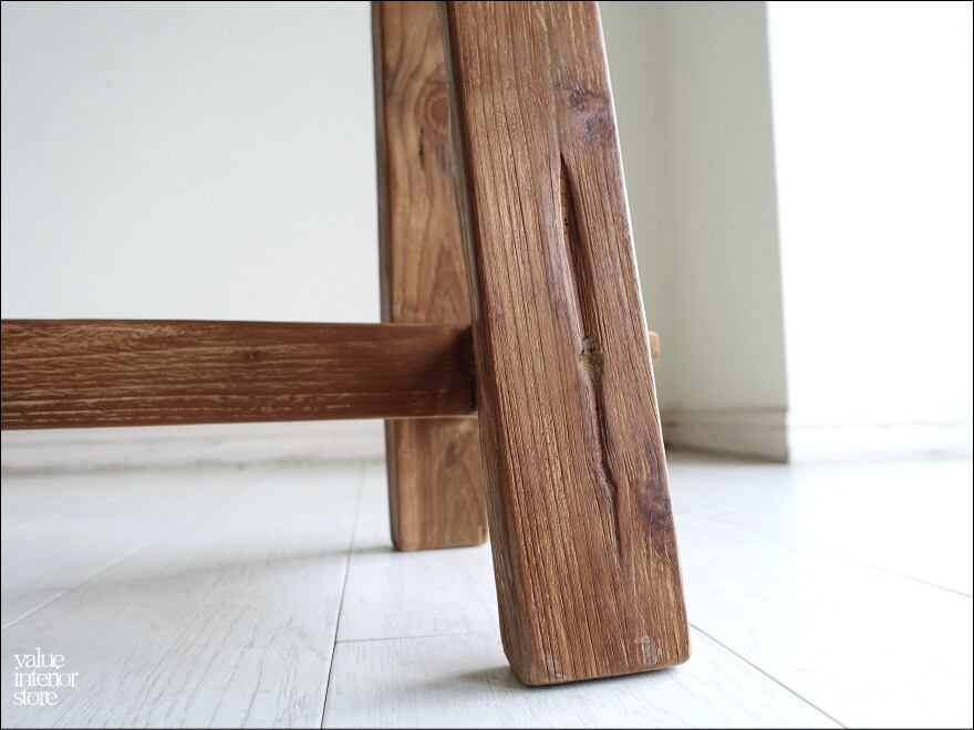 硬いチーク材ならではの荒々しさがありますが、良く紙やすりで磨かれていますので滑らかで、一枚板の座面は厚みもあり長くお使いいただけるしっかりした作りです。チークならではの美しい木目が全体的に見られとても味わい深いお品。職人さんが丹精こめて作った印象に溢れていて、きっとお部屋をスローダウンした素敵な雰囲気に包んでくれます。ベンチだけでなくインテリアのディスプレイ台としてもステキです。