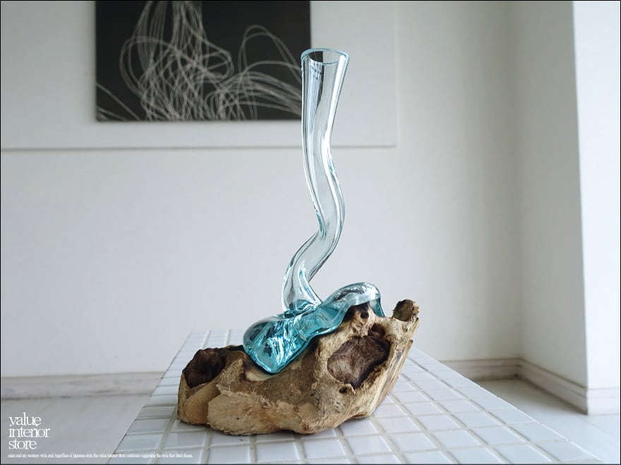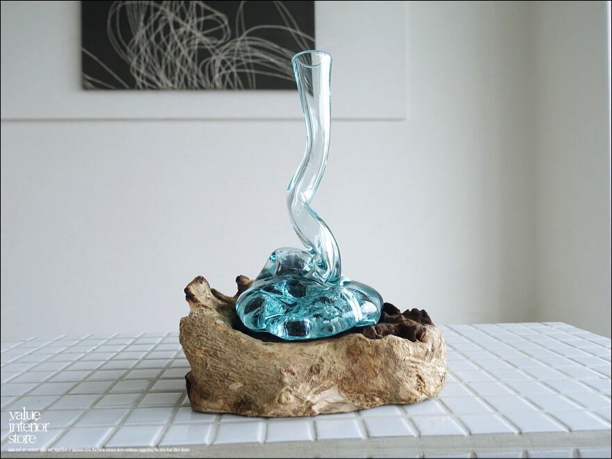 プリミティブな無垢材の土台に吹きガラスを合わせたフラワーベース。一点一点手作りで同じ形のものはなく、どちらの素材も大変個性的で味があります。主役のお花を一層引き立たせてくれます。