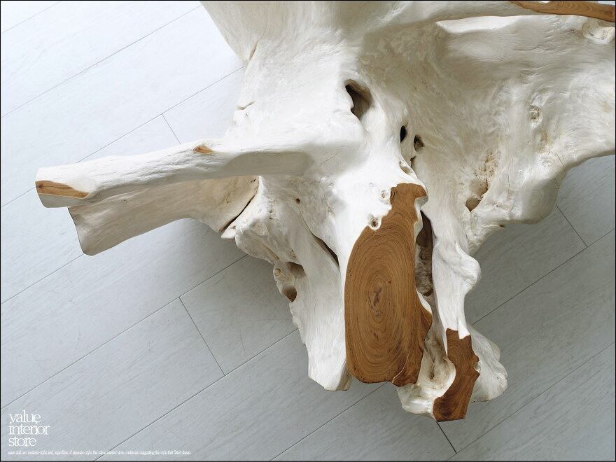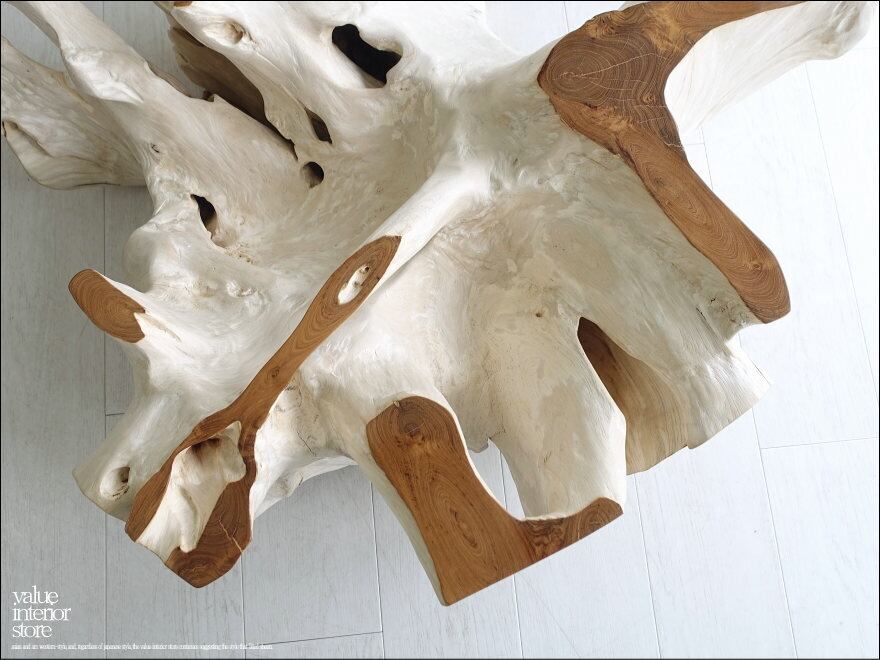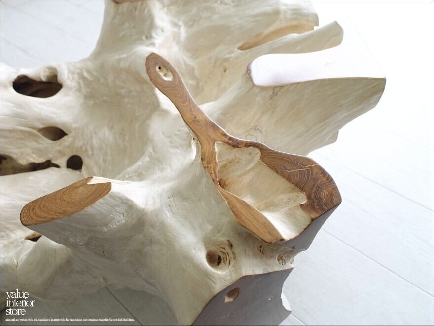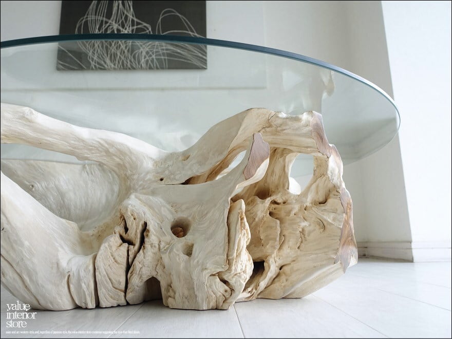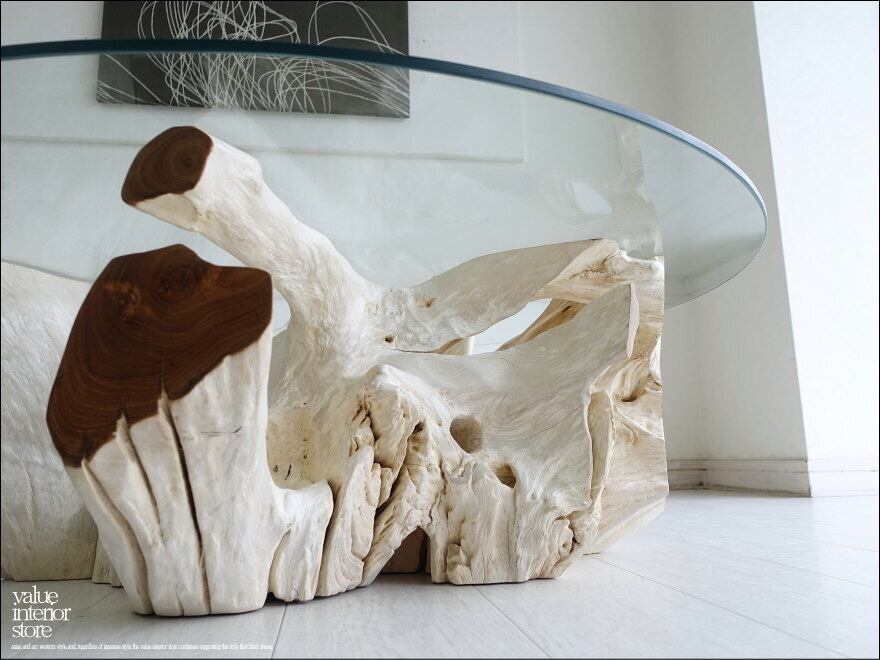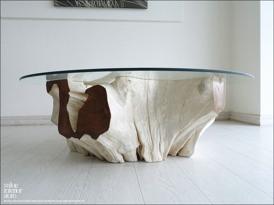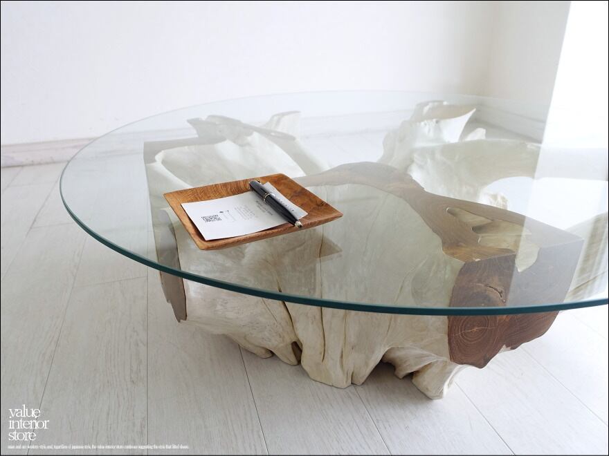 チークの根本をテーブルに使った何ともプリミティブなガラステーブル。