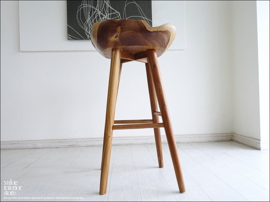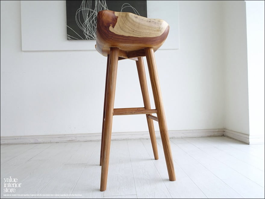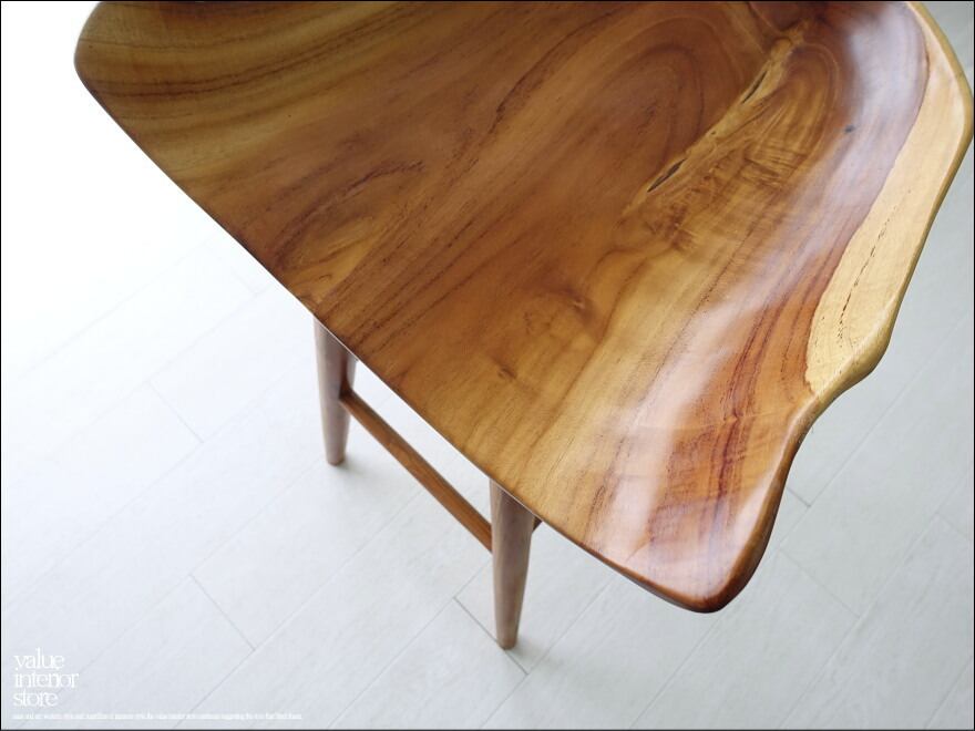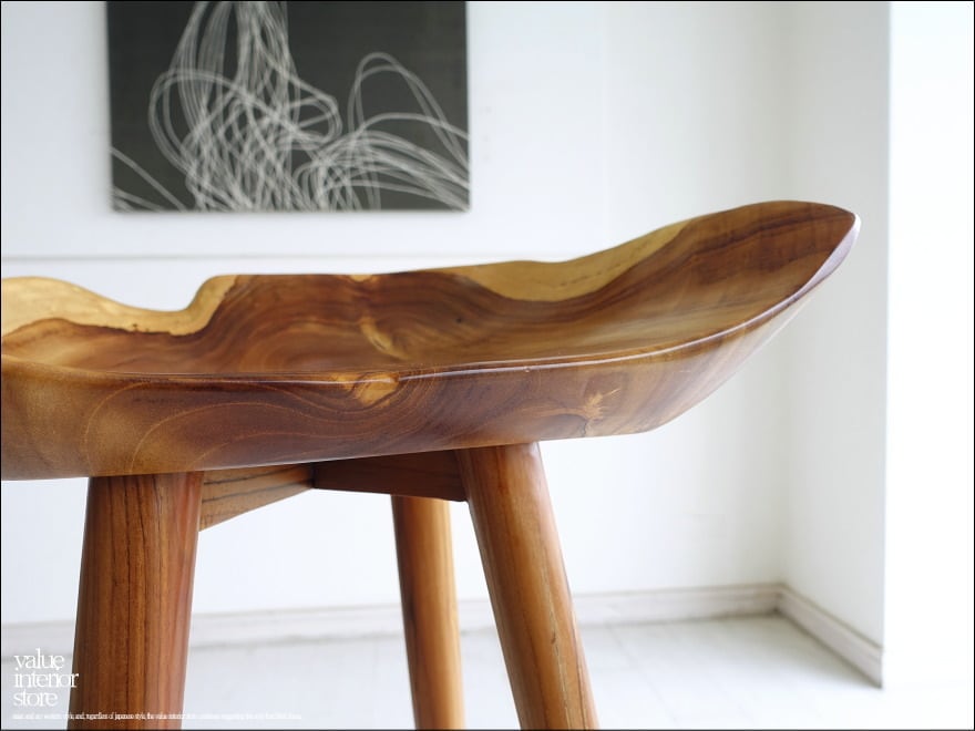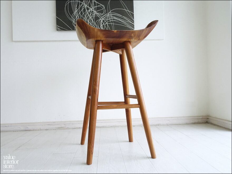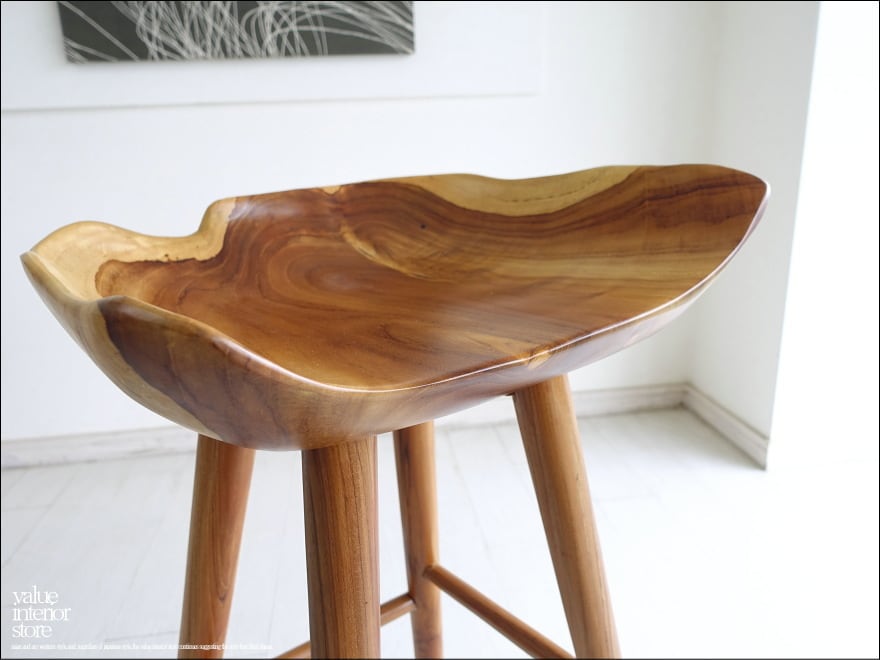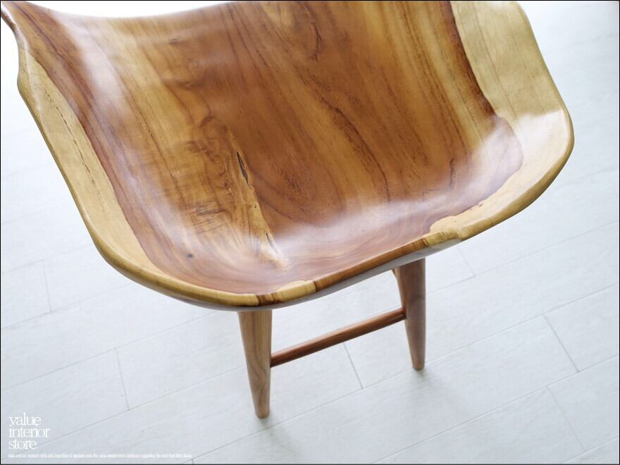 プリミティブな座面が何とも印象的なチーク総無垢材のバースツール。一つ一つ変化に富んだ木肌も素敵です。おしりを包み込むようにホールドしてくれるような座面の形は座り心地も良くお勧めです。