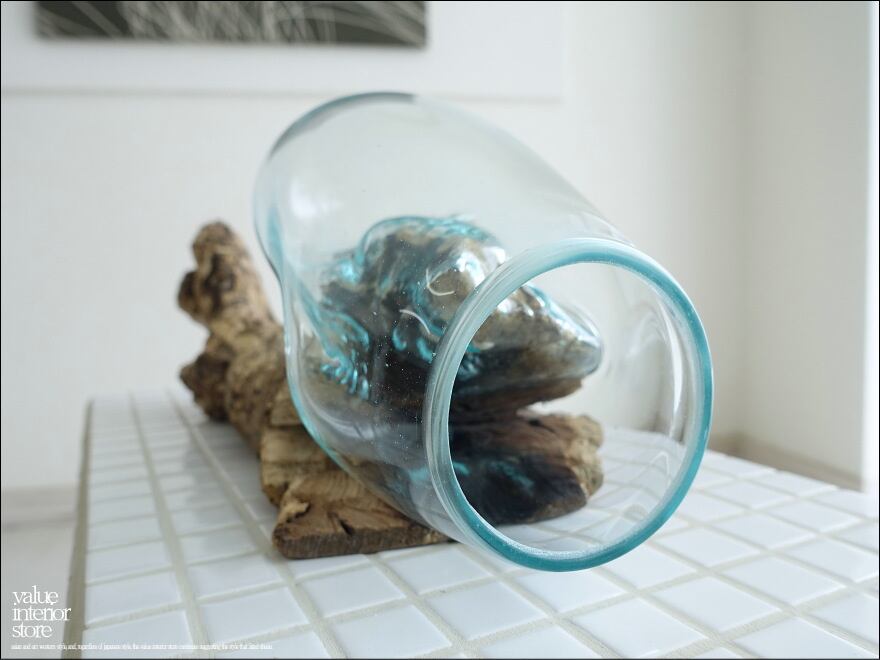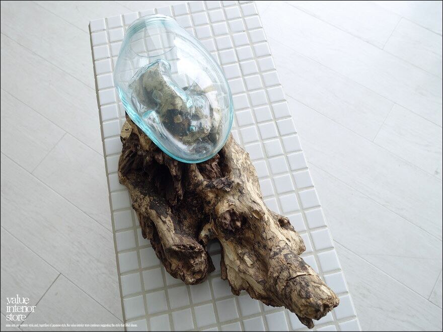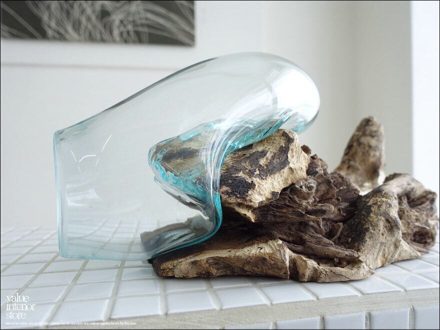 プリミティブな無垢材の土台に吹きガラスを合わせたフラワーベース。一点一点手作りで同じ形のものはなく、どちらの素材も大変個性的で味があります。主役のお花を一層引き立たせてくれます。
