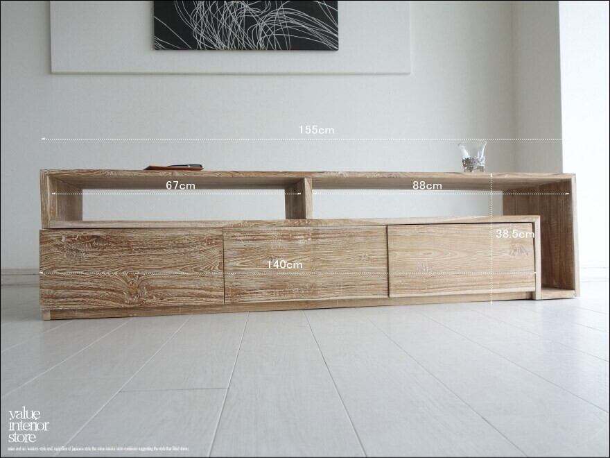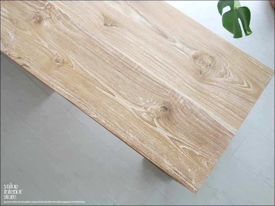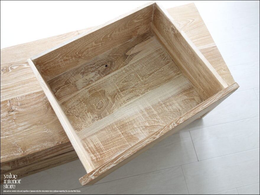 横幅は155cmから最大で200cm程度まで伸ばすとができます。大きめの引出しもありますので細かなものの収納ができ便利。表面は凹みにわずかに入った白色がシャビーで素朴な印象を感じられます。