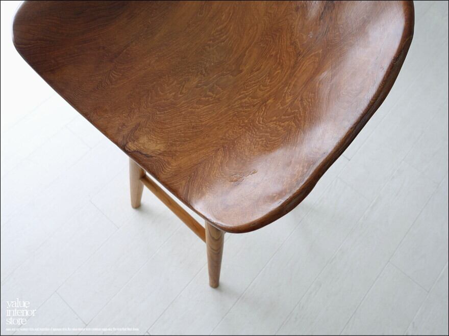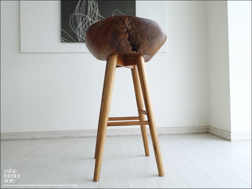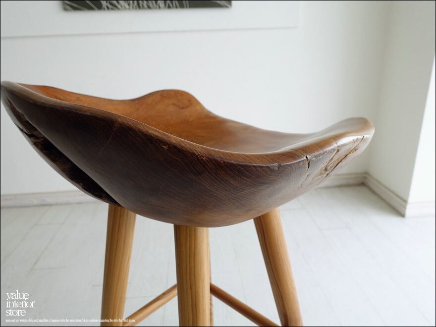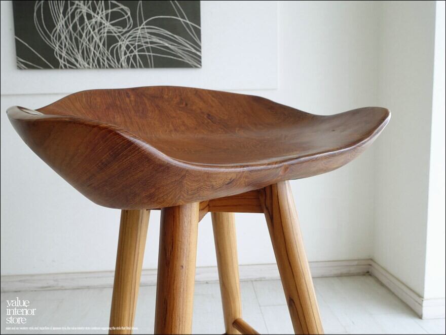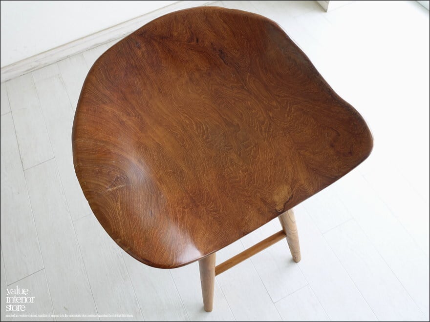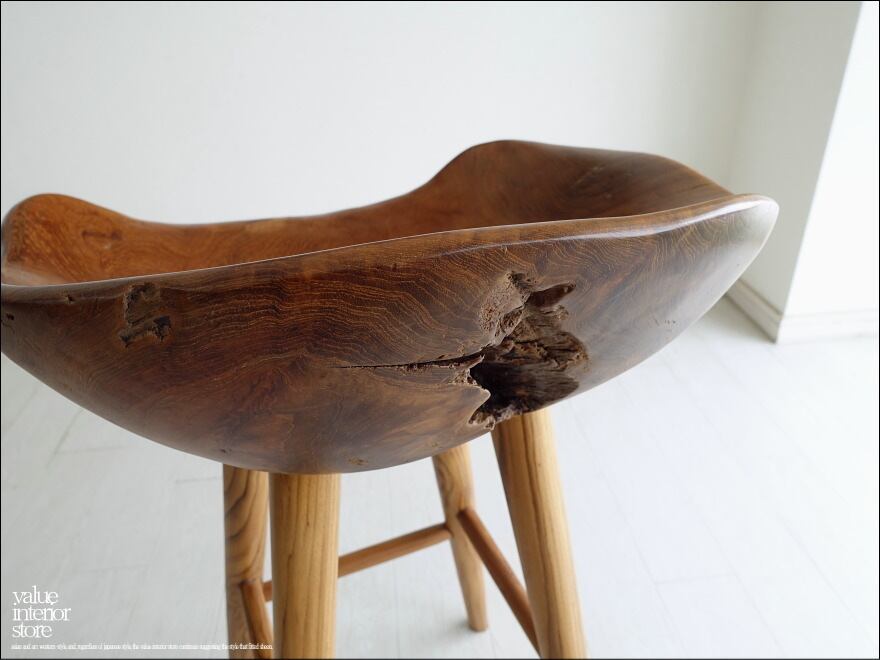 プリミティブな座面が何とも印象的なチーク総無垢材のバースツール。一つ一つ変化に富んだ木肌も素敵です。おしりを包み込むようにホールドしてくれるような座面の形は座り心地も良くお勧めです。