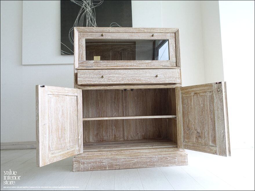一番上のガラス扉は手前に引いて開きます。中断には引出し、下は観音扉のキャビネットとそれぞれ異なった用途にお使いいただけますので、リビングやキッチンでは保管庫などとしても収納力を発揮します。