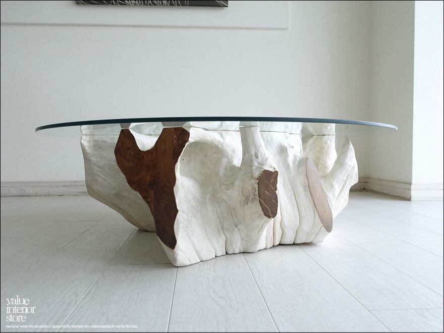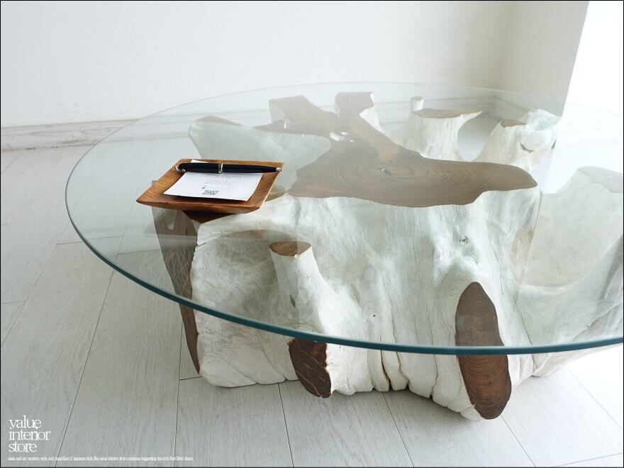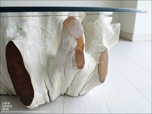 チークの根本をテーブルに使った何ともプリミティブなガラステーブル。