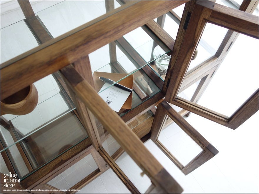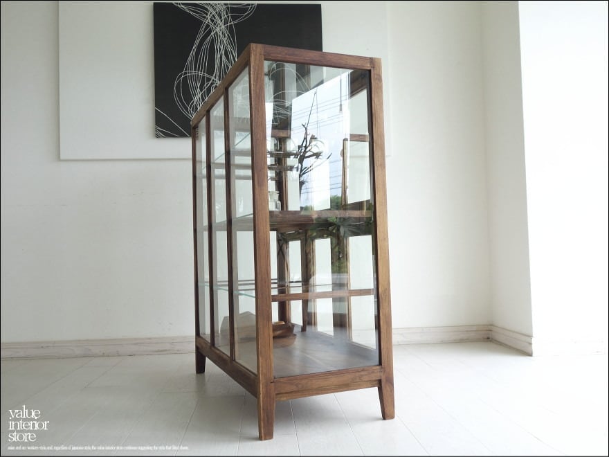 フレームはチーク総無垢材で金具は真鍮製を使用いたしました。ガラス面が多くどの角度からも中がキレイに見えますので、お店のショーケースとしてもお使いいただけます。